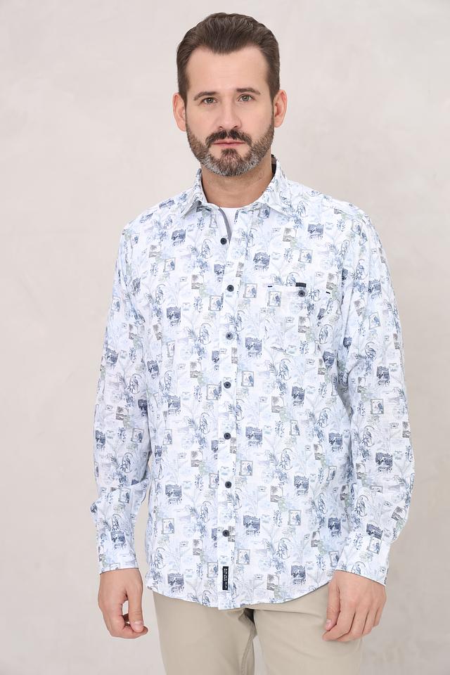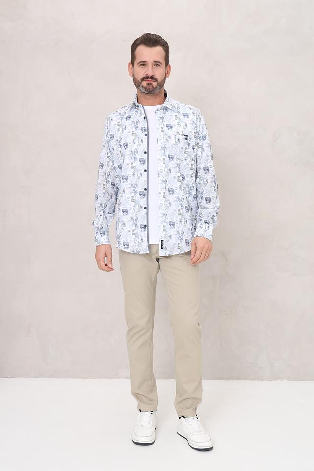 Рубашка имеет классический крой с длинными рукавами и стандартной посадкой. Её отличает яркий и запоминающийся принт, выполненный в голубой цветовой гамме с добавлением различных рисунков и узоров.