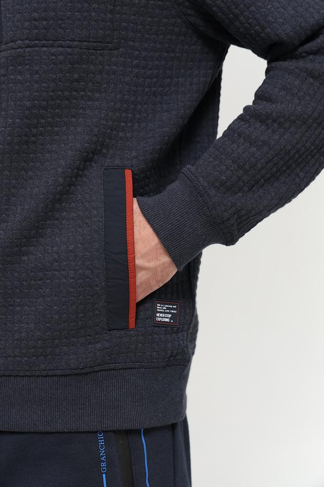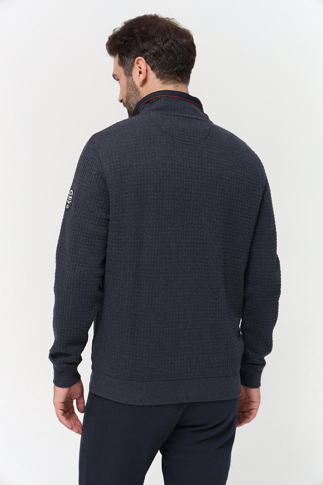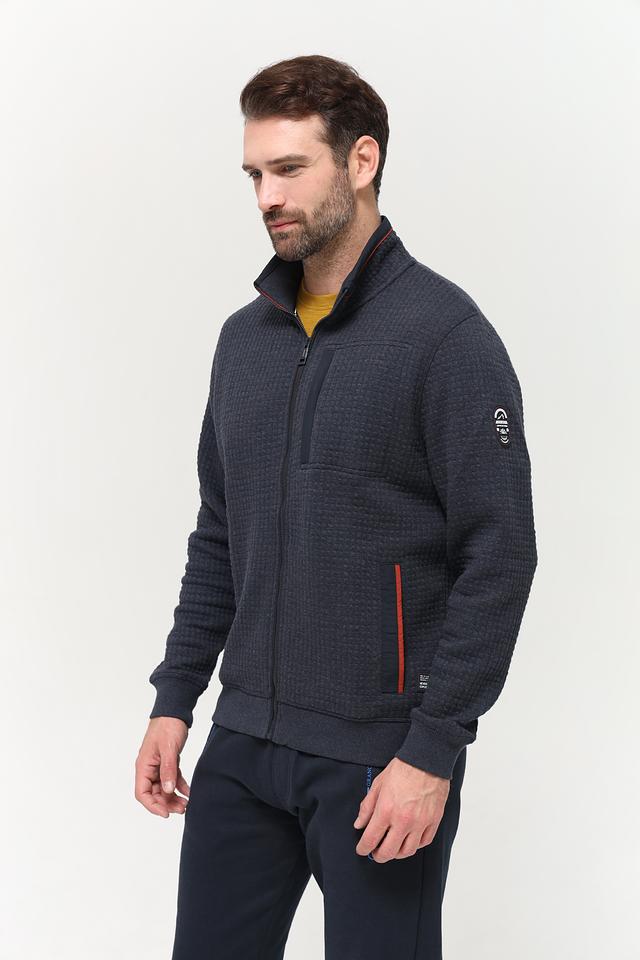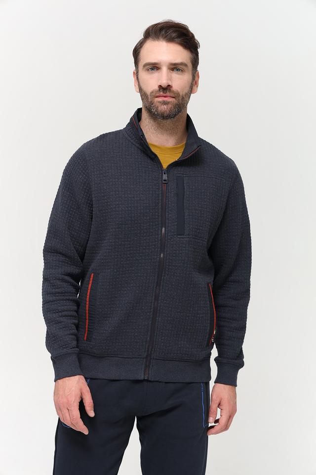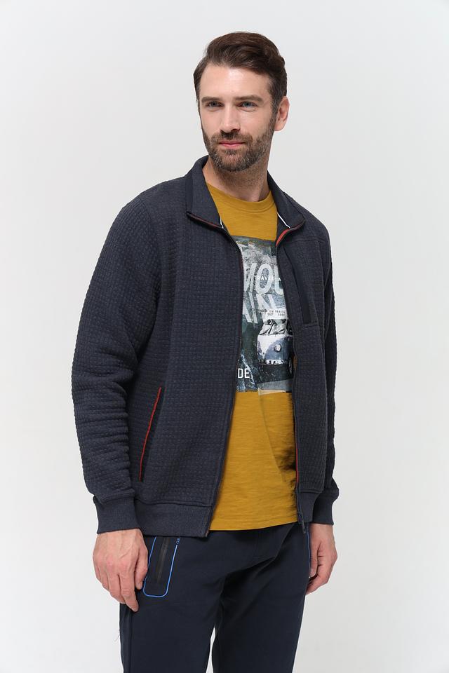 Мужской кардиган Casa Moda темно-синего цвета с фактурной стеганой поверхностью. Изготовлен из сочетания полиэстера, хлопка и эластана, обеспечивающего комфорт и удобство в носке. Состав: полиэстер 57%, хлопок 40%, эластан 3%