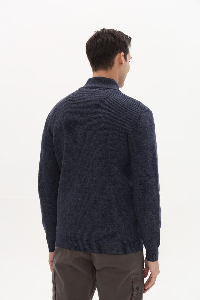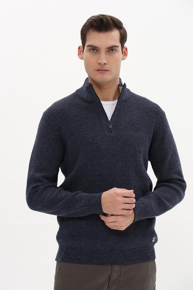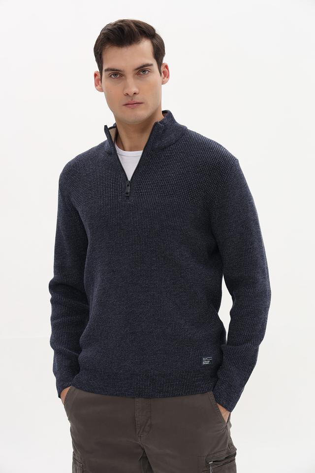 Мужской джемпер Casa Moda синего цвета с воротником-стойкой и короткой молнией. Изготовлен из мягкого трикотажа с текстурной вязкой, что обеспечивает комфорт и стильный внешний вид. Состав: хлопок 62%, полиэстер 28%, полиамид 10%