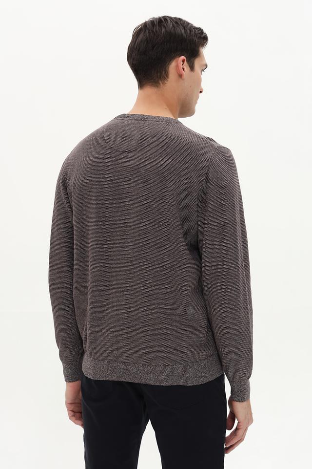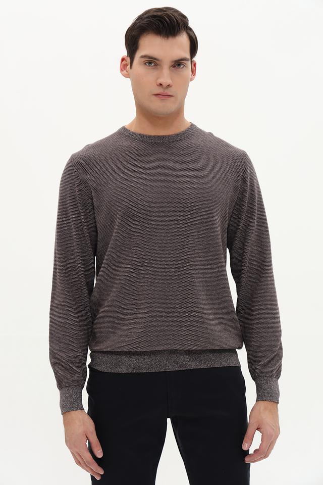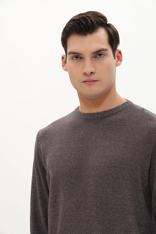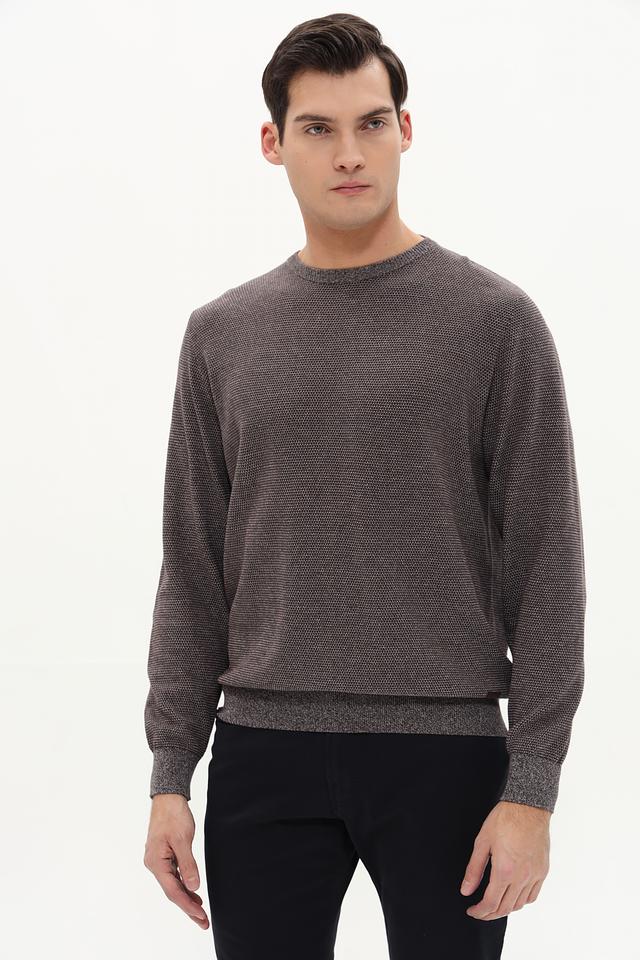 Джемпер имеет классический крой с круглым вырезом горловины и длинными рукавами. Манжеты и нижний край изделия выполнены резинкой, что обеспечивает удобную посадку по фигуре. Текстура ткани с мелким узором придает джемперу интересный вид.