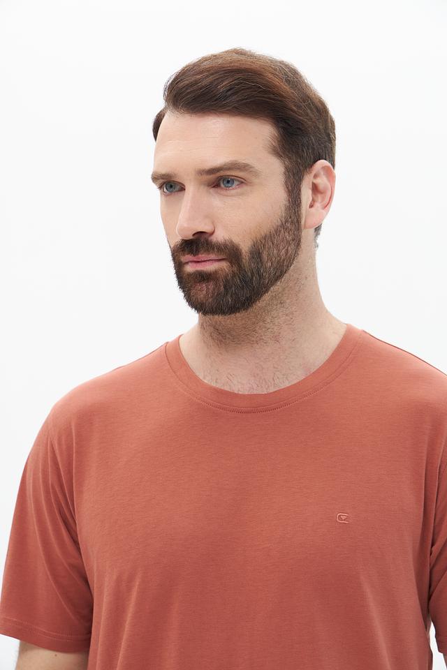 Цвет футболки – терракотовый, спокойный и универсальный оттенок, который легко сочетается с различными элементами гардероба. На груди располагается небольшой логотип бренда, выполненный в тон ткани.
