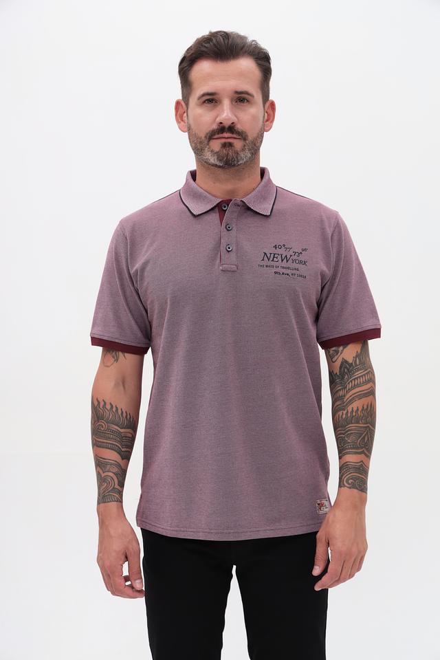 На груди расположена яркая графика с надписью "New York", что придает поло индивидуальность. Горловина и рукава отделаны темной бордовой полосой, создавая контрастный эффект.