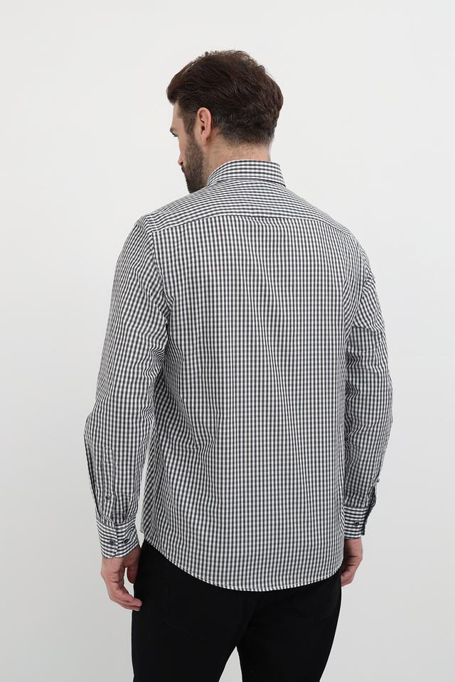 Основной цвет рубашки – белый, дополненный графичным чёрным рисунком в клетку. Это сочетание делает рубашку универсальной и легко сочетаемой с различными элементами гардероба. Рубашка выполнена из 100% хлопка, что обеспечивает приятные тактильные ощущения и хорошую воздухопроницаемость.