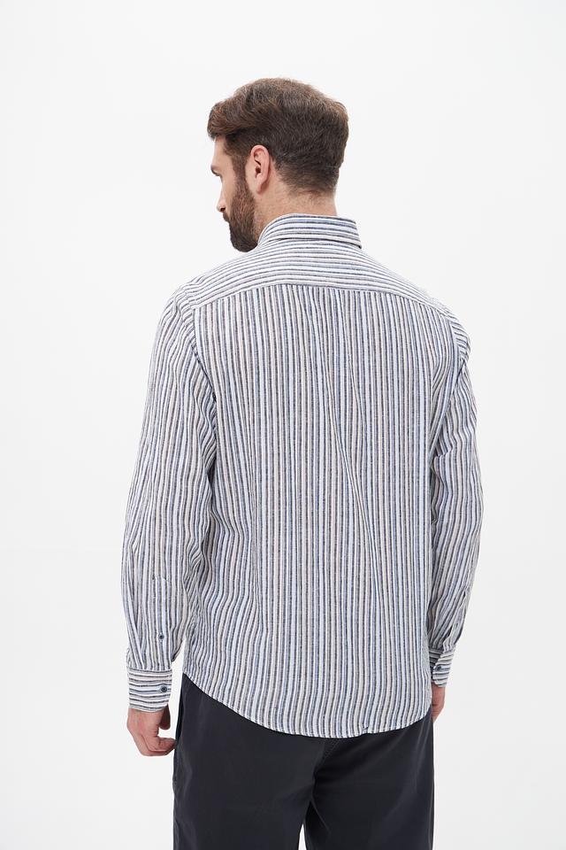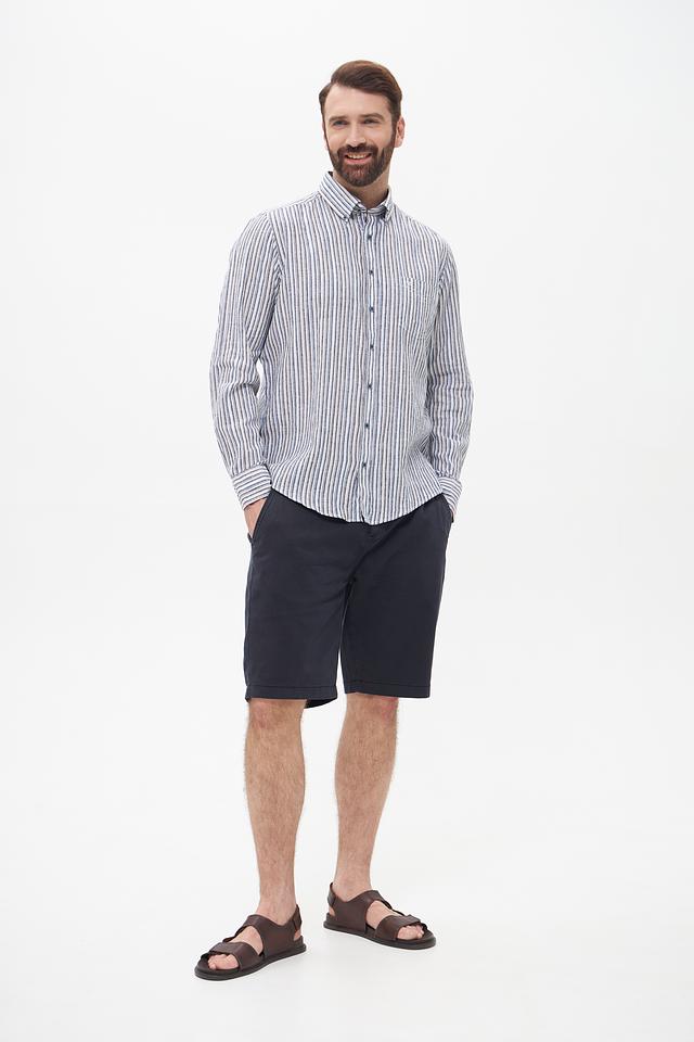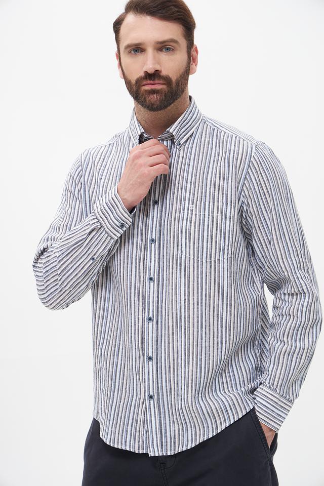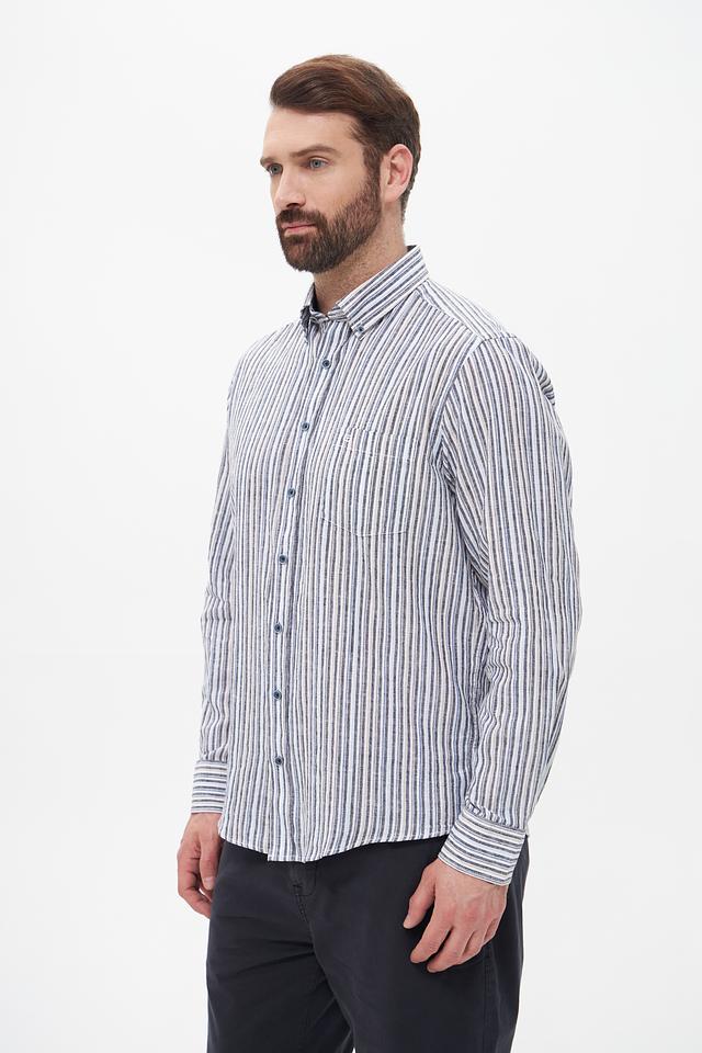 Основной цвет рубашки – белый, но она украшена вертикальными полосами синего оттенка, что придает ей свежий и современный вид. Рукава рубашки имеют манжеты на пуговицах, которые можно застегнуть или оставить расстегнутыми для создания более расслабленного образа.