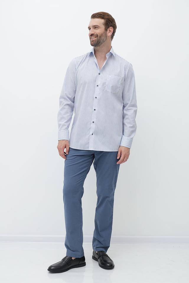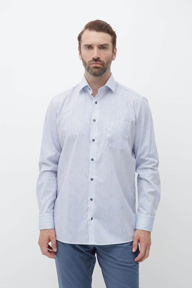 Рубашка имеет классический крой, длинные рукава и стандартный воротник. Голубая полоска придает ей свежий и современный вид, делая ее подходящей как для офиса, так и для повседневной носки.