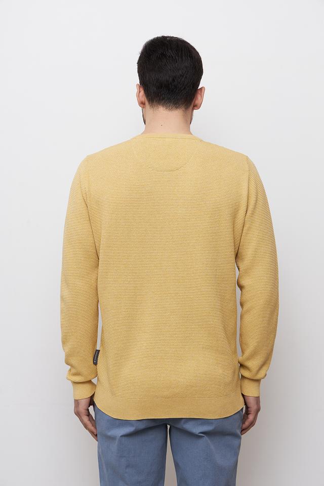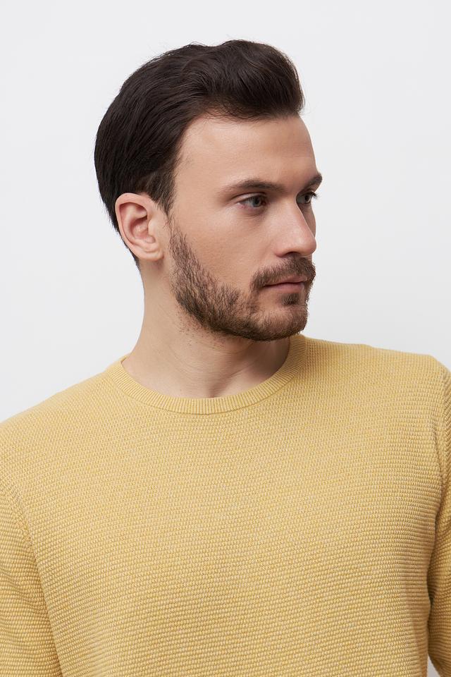 Пуловер имеет классический крой с круглым вырезом горловины и длинными рукавами. Текстурная вязка придает изделию особый шарм и визуальный интерес. Горчичный цвет делает этот пуловер универсальным элементом гардероба, который легко сочетается с различными стилями одежды.