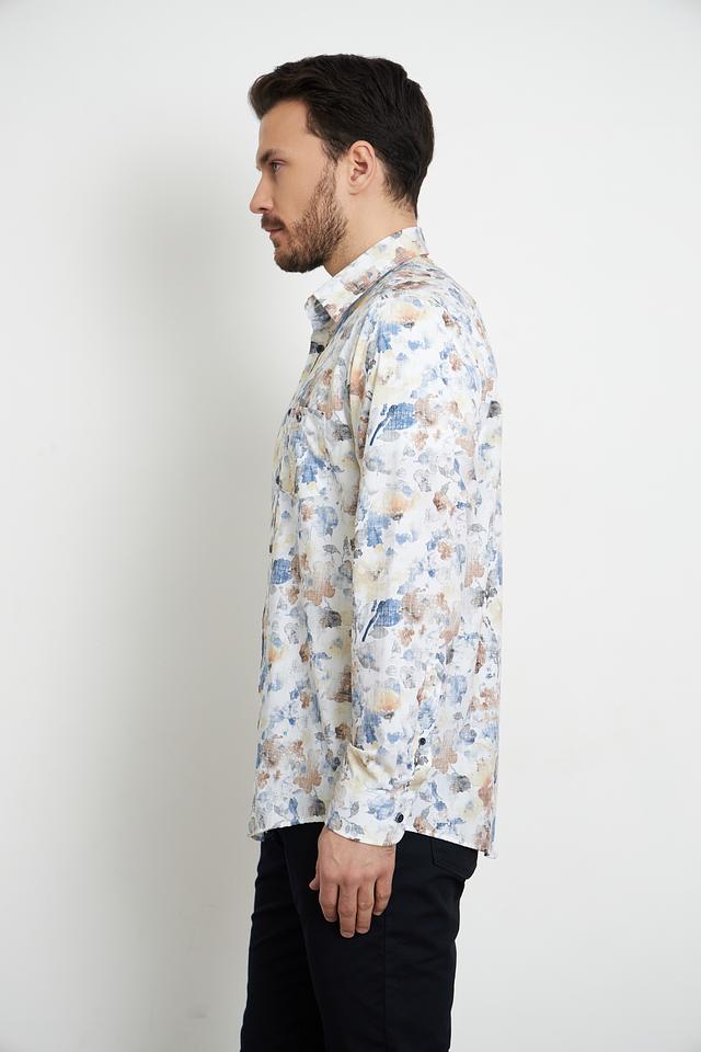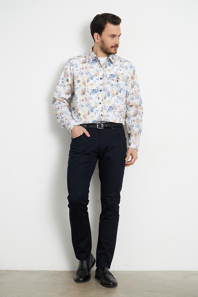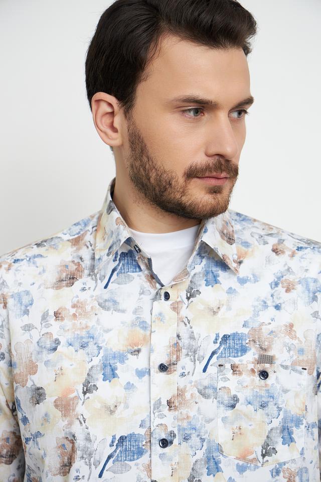Эта стильная рубашка от Casa Moda выполнена в светло-бежевом цвете и украшена оригинальным цветочным принтом, сочетающим в себе оттенки голубого, жёлтого и коричневого. Рубашка имеет классический крой с длинными рукавами и стандартной воротником.
