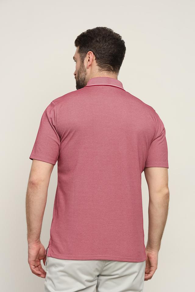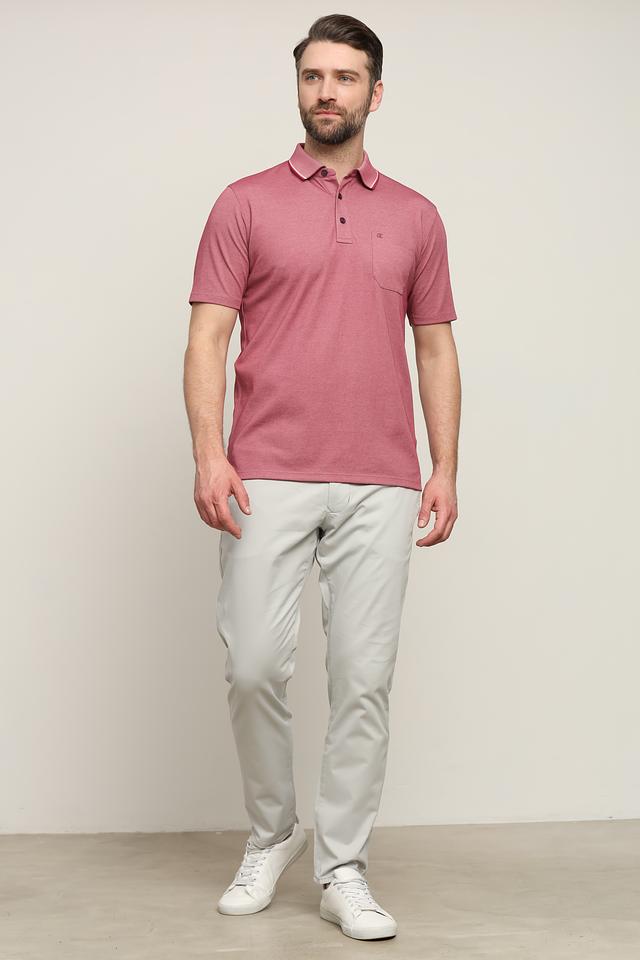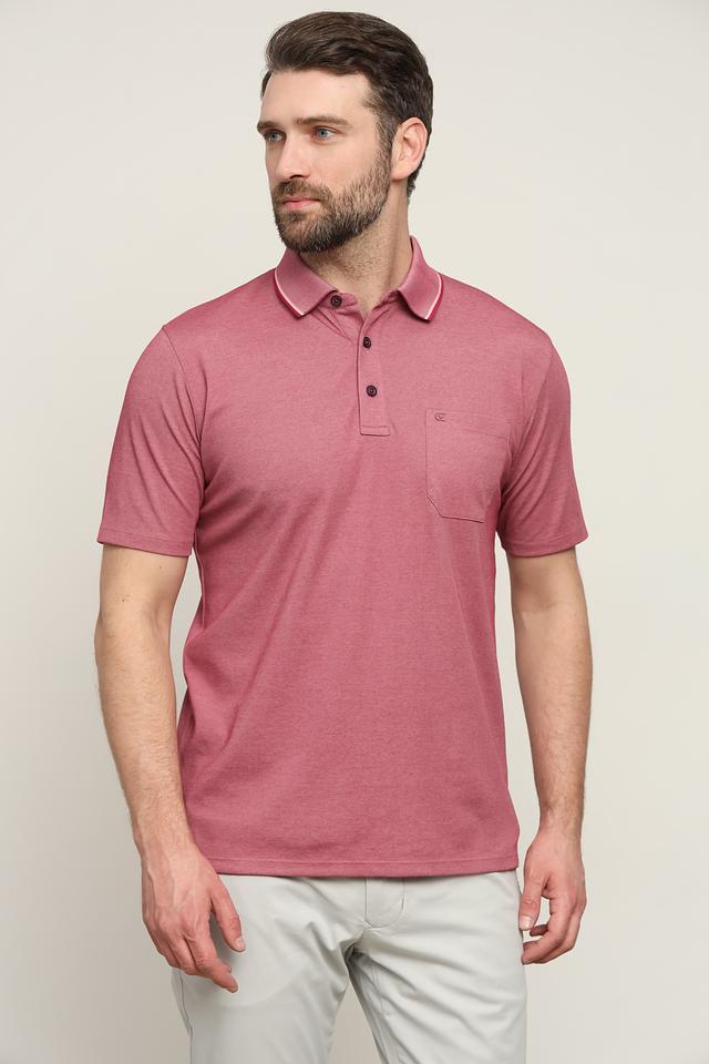 Это мужское поло от бренда Casa Moda выполнено в насыщенном малиновом цвете. Модель имеет классический крой, короткие рукава и воротник на планке с тремя пуговицами.