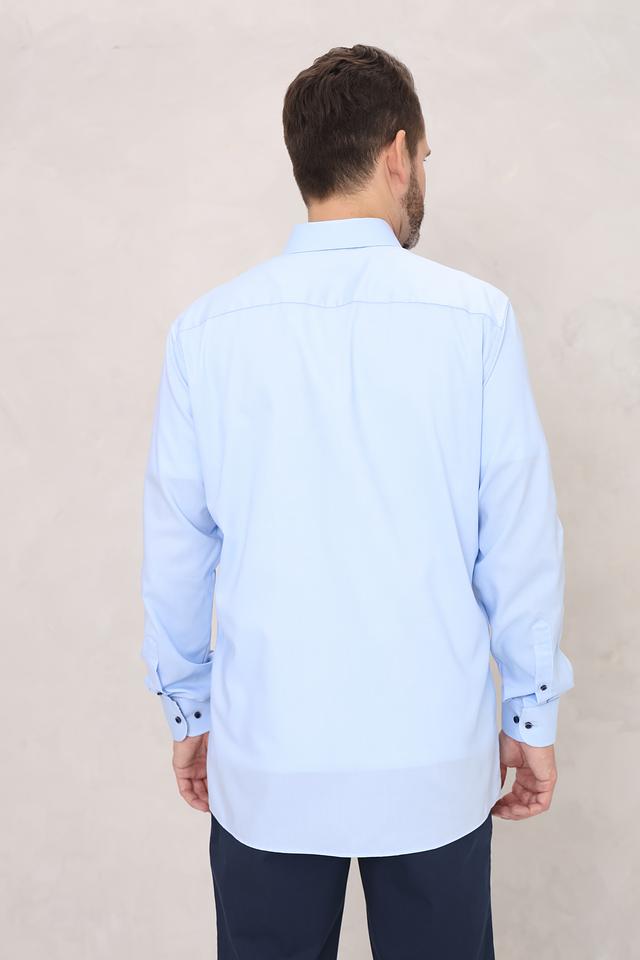 Рубашка имеет классический крой с длинными рукавами и стандартной посадкой. Отличительной особенностью является контрастная отделка по планке пуговиц и на манжетах, выполненная в тёмно-синем цвете, что добавляет рубашке изысканности.