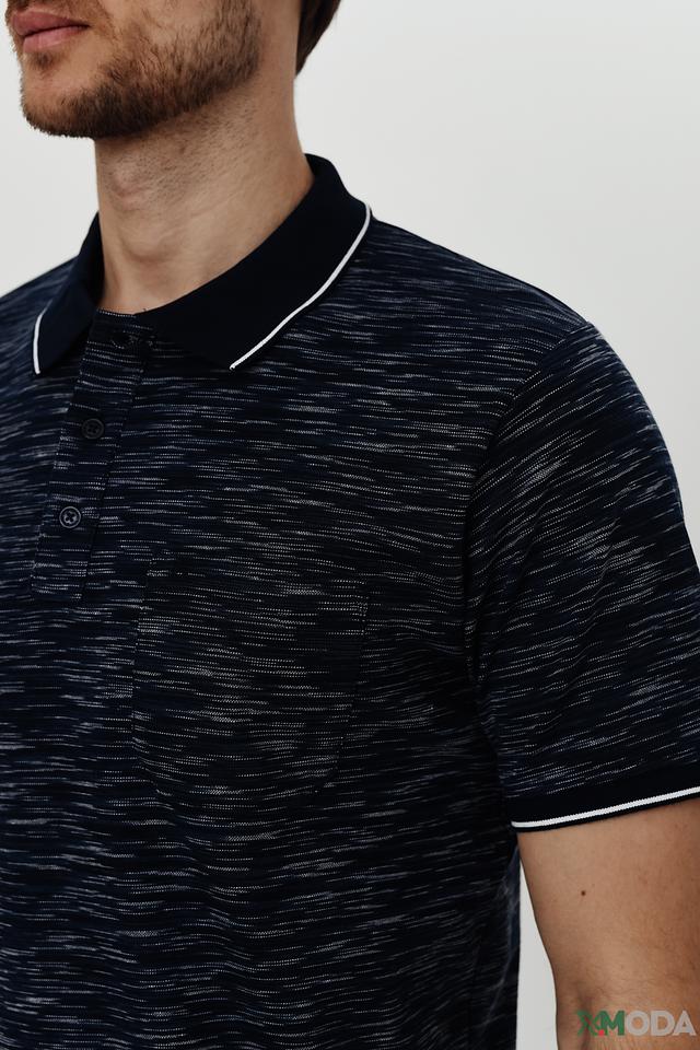 Мужское поло Casa Moda тёмно-синего цвета с оригинальным меланжевым узором и белой отделкой. Изготовлено из сочетания хлопка и полиэстера, обеспечивающего комфорт и практичность. Состав: полиэстер 52%, хлопок 48%