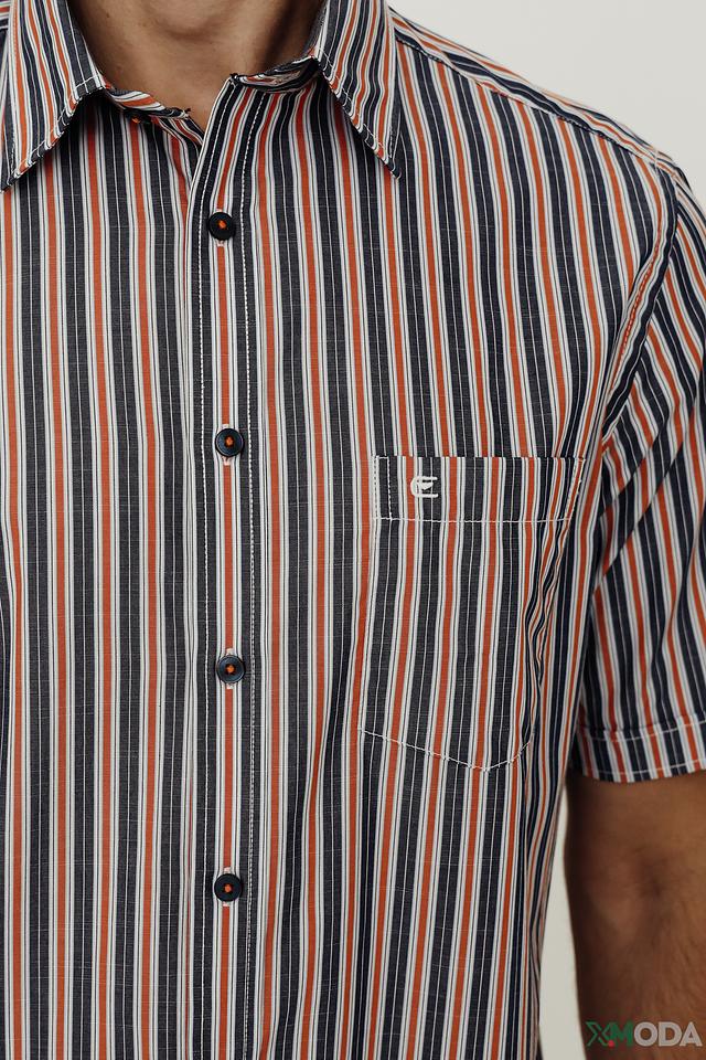 Рубашка имеет классический крой, короткие рукава и воротник стандартной формы. Её особенностью является яркая полосатая расцветка, сочетающая в себе оттенки синего, оранжевого и белого. На груди расположена небольшая планка с логотипом бренда.