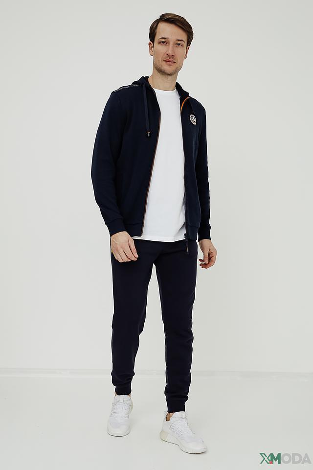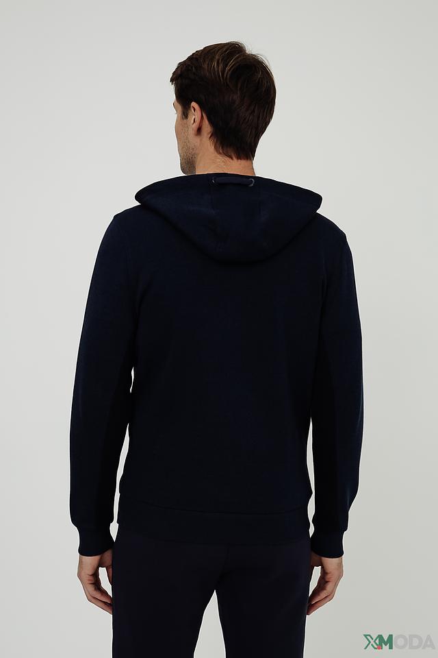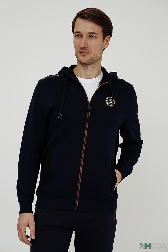Мужской кардиган Casa Moda темно-синего цвета с капюшоном и оранжевой молнией. Модель выполнена из мягкого хлопка с добавлением полиэстера, что обеспечивает комфорт и практичность. Состав: хлопок 88%, полиэстер 12%