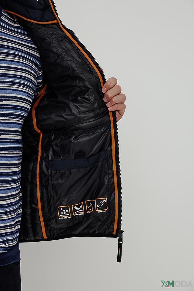 Внутренняя часть куртки имеет оранжевую отделку, что добавляет ей яркий акцент. На подкладке расположены логотипы и значки, подтверждающие качество и функциональность изделия.