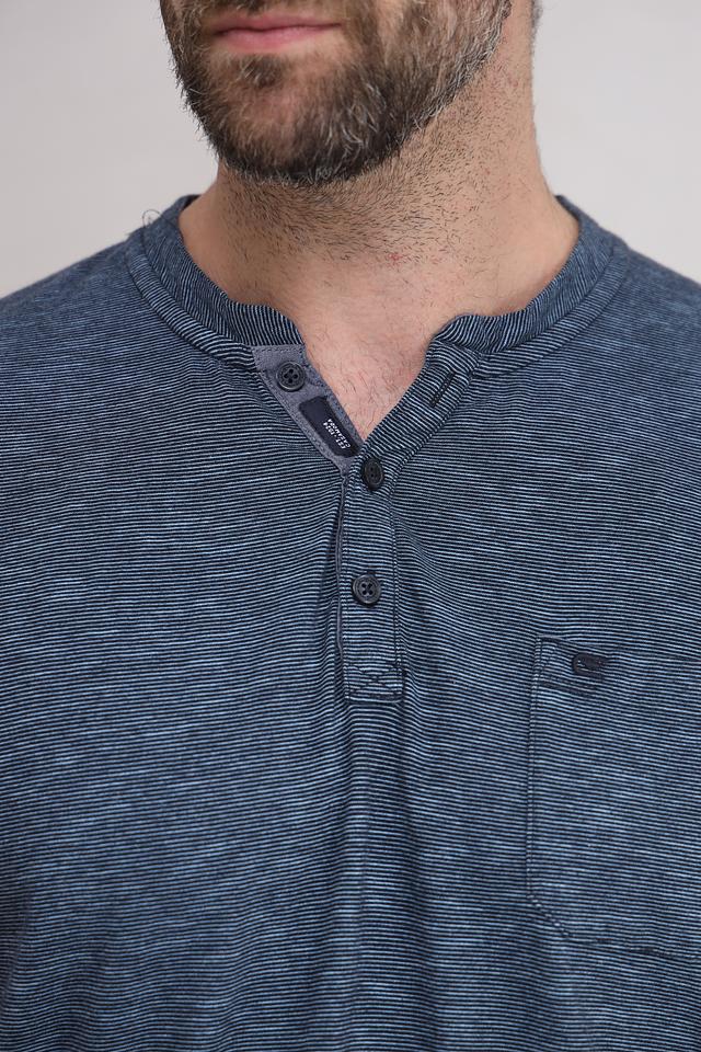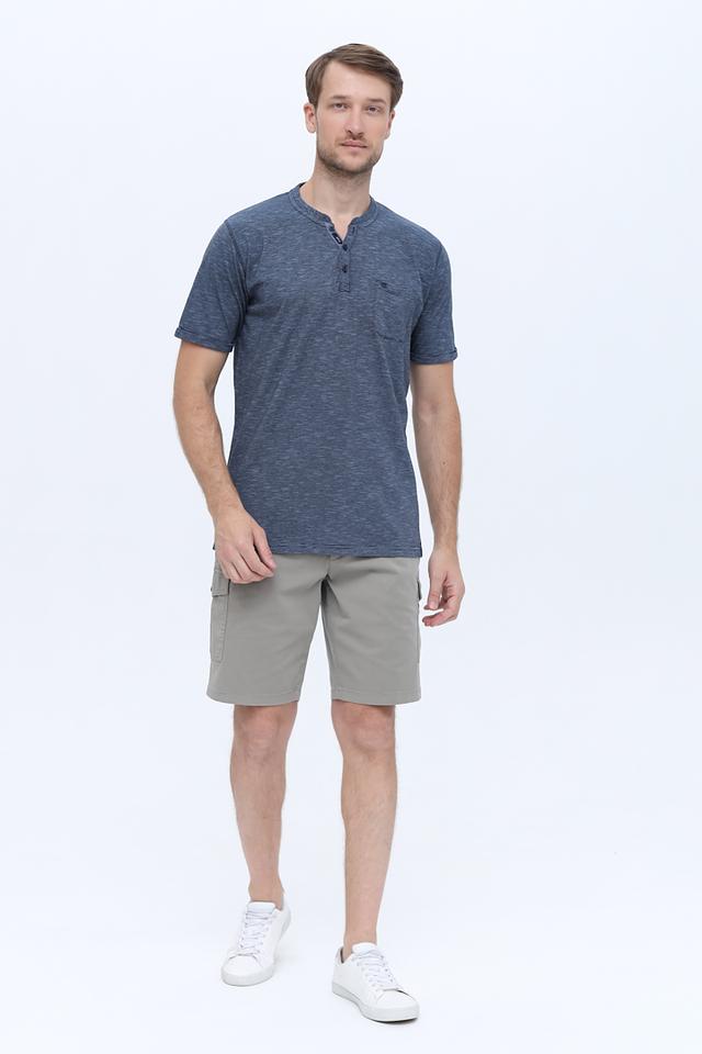 Модель имеет короткий рукав и воротник-стойку с планкой на три пуговицы. На груди расположен накладной карман. Футболка выполнена из 100% хлопка, что обеспечивает комфорт при носке и позволяет коже дышать.