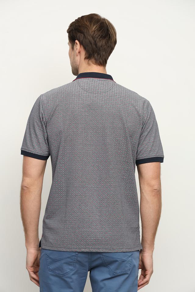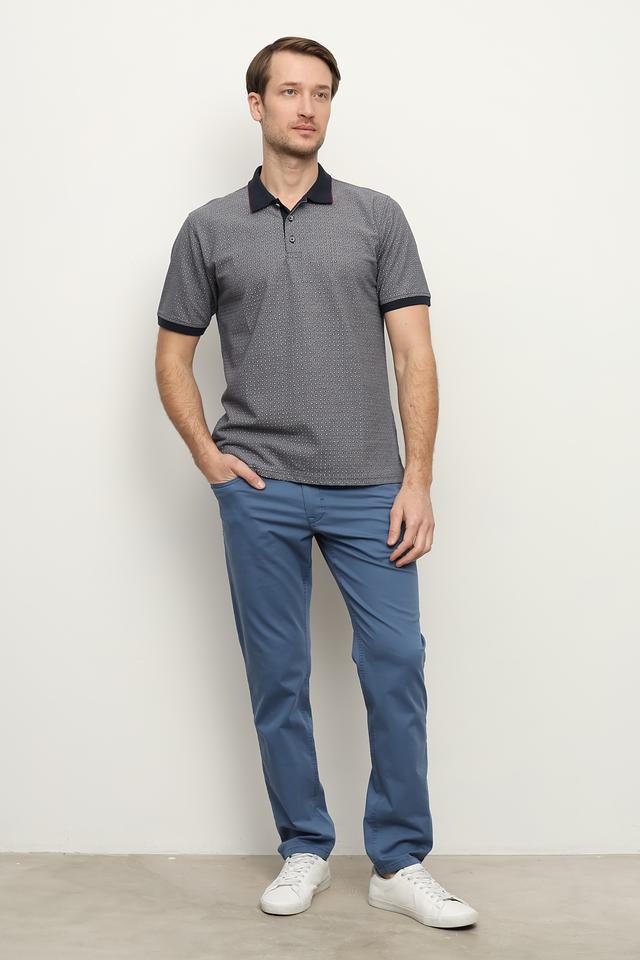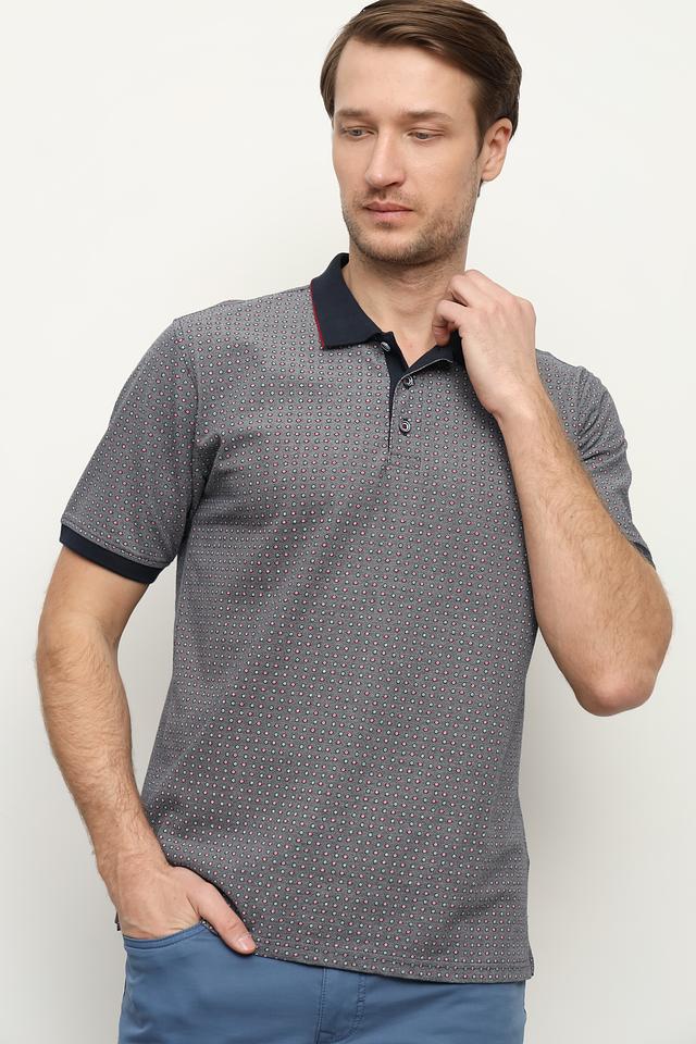 Основной цвет поло – серый, украшенный мелким геометрическим принтом в красных и тёмно-синих тонах. Воротник и манжеты отделаны тёмно-синей полоской, что добавляет контрастности и завершенности образу.