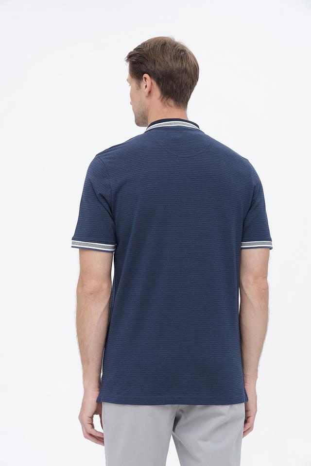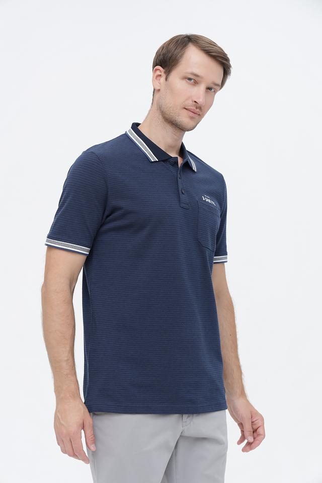 Мужское поло Casa Moda темно-синего цвета с коротким рукавом и воротником на белой полоске. Изготовлено из текстурированного трикотажа с небольшим карманом на груди, что придает модели стильный и современный вид. Состав: хлопок 100%