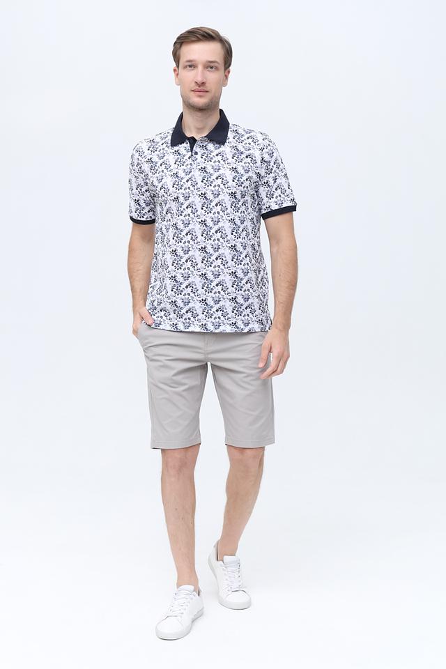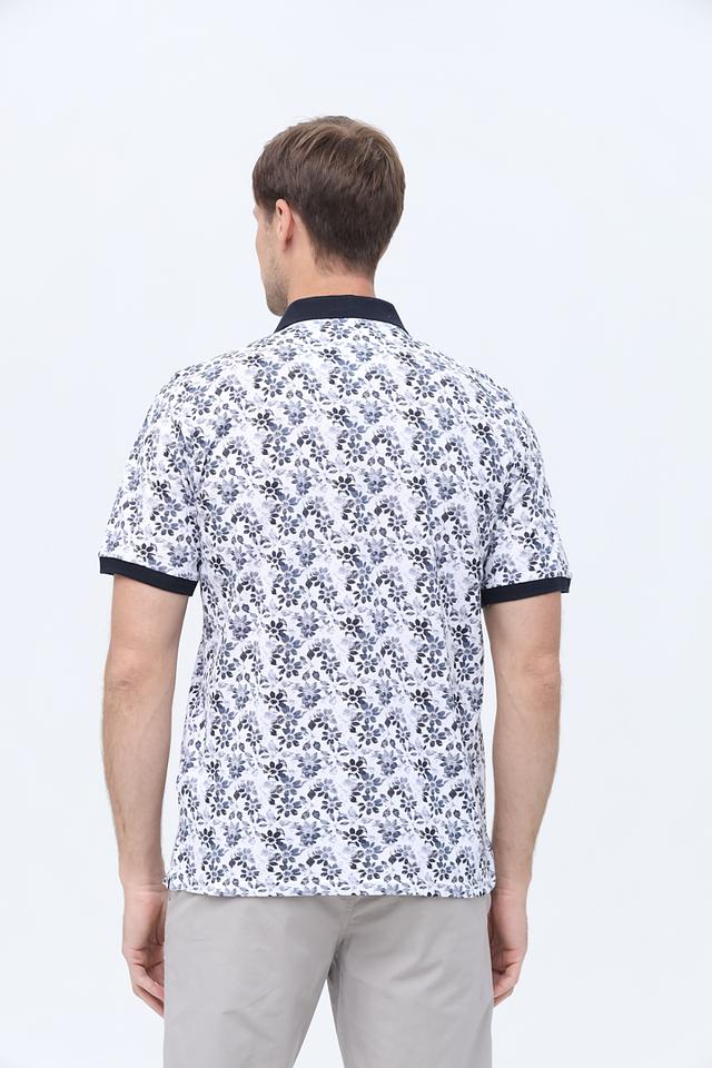 Мужское поло Casa Moda белого цвета с оригинальным цветочным принтом и тёмно-синим воротником и манжетами. Изготовлено из 100% хлопка, обеспечивающего комфорт и воздухопроницаемость. Состав: хлопок 100%