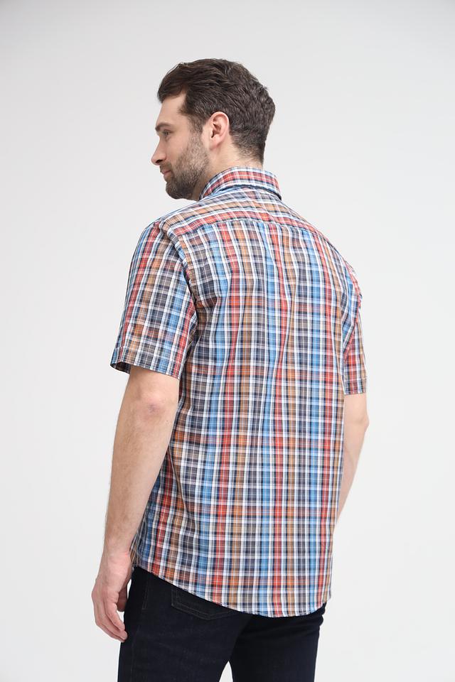 Рубашка имеет классический крой с короткими рукавами и стандартным воротником. Яркий клетчатый принт в сочетании оранжевого, синего, коричневого и белого цветов делает эту рубашку заметной и привлекательной.