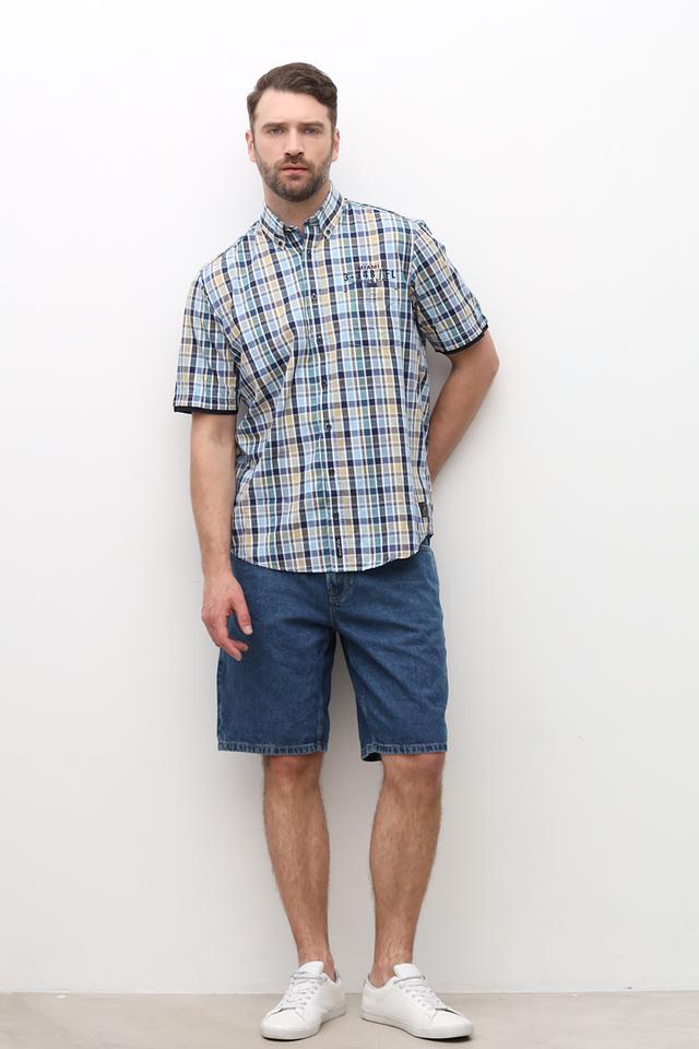 Основной цвет рубашки – голубой, дополненный клетчатым узором в сочетании жёлтых, синих и бежевых оттенков. Воротник рубашки выполнен в классическом стиле. На груди расположен небольшой принт с логотипом бренда.