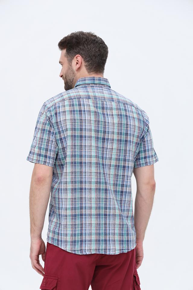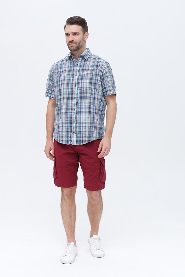 Рубашка имеет классический крой с короткими рукавами и стандартным воротником. Её главным отличием является яркий клетчатый рисунок, выполненный в сочетании голубого, зелёного и бежевого цветов. Эта рубашка легко сочетается с шортами, брюками чинос или джинсами.