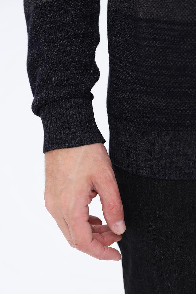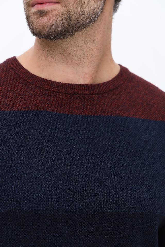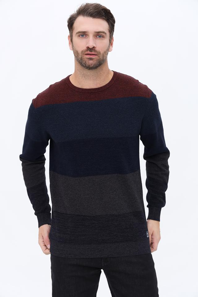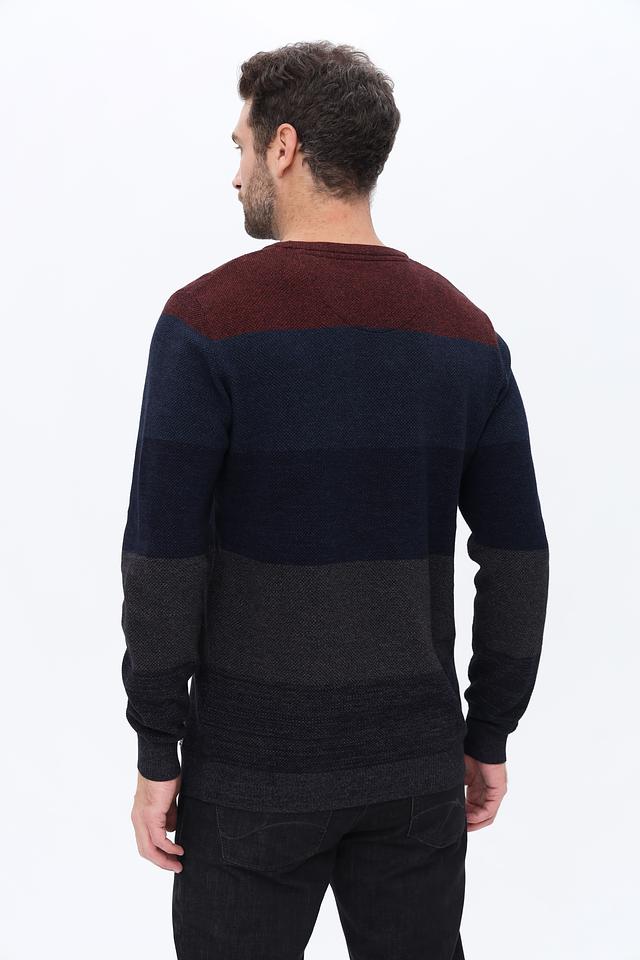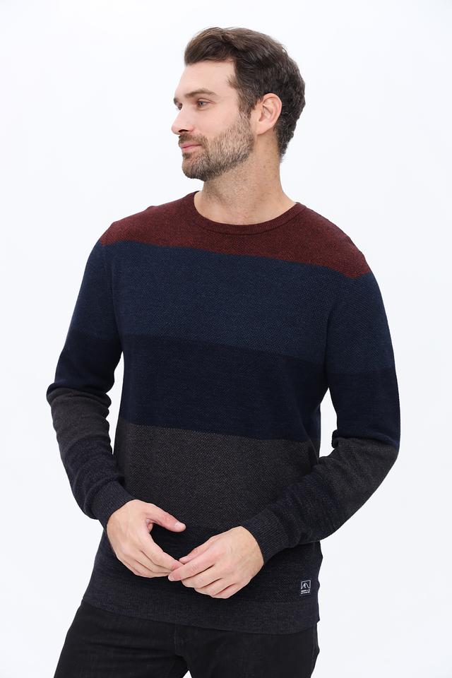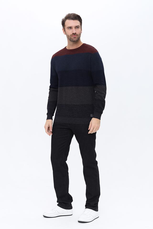 Джемпер имеет оригинальный дизайн с горизонтальными полосами бордового, темно-синего и серого цветов. Классический круглый вырез горловины и длинные рукава делают его универсальным для различных образов.