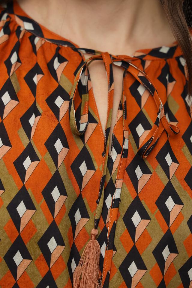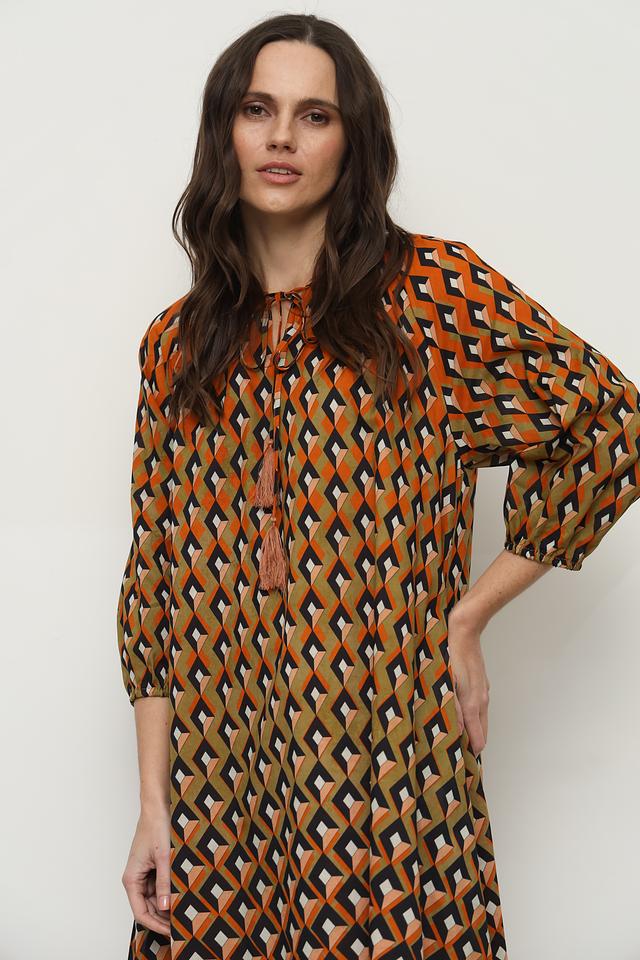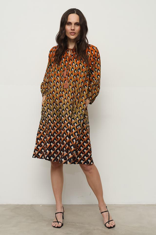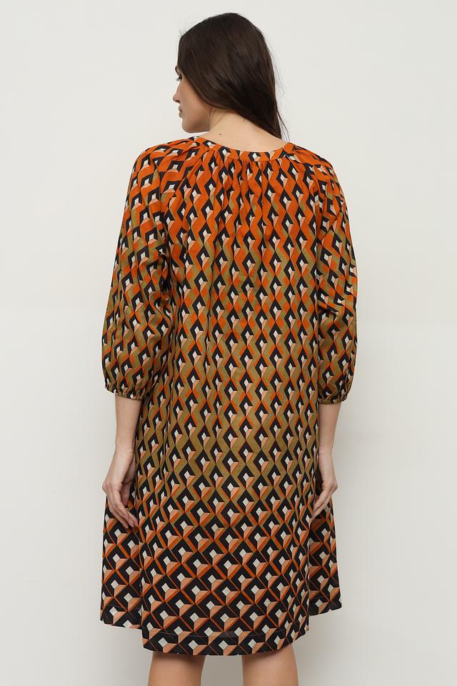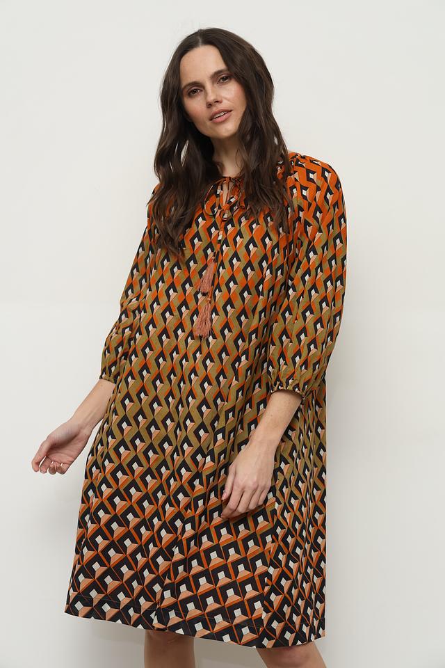 Основной цвет платья – оранжевый, но благодаря сложному геометрическому принту, в нем присутствуют также чёрный, коричневый и оливковый оттенки. Принт создает яркий и запоминающийся образ, который подойдет для различных случаев.