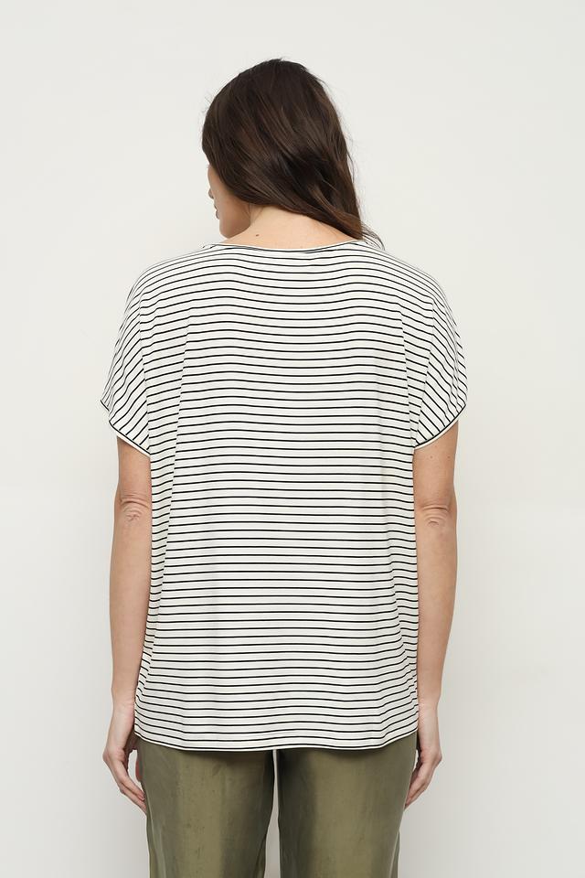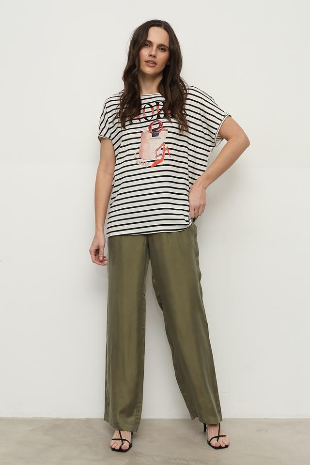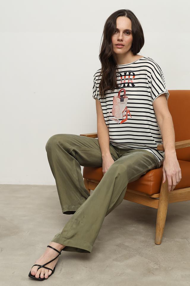 Классический крой с короткими рукавами и округлым вырезом горловины обеспечивает свободу движений. Футболка выполнена в бело-черной полоску, которая визуально стройнит фигуру. Главная особенность этой модели – яркий принт с изображением птицы, который добавляет образу оригинальности и индивидуальности.