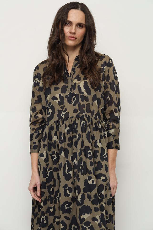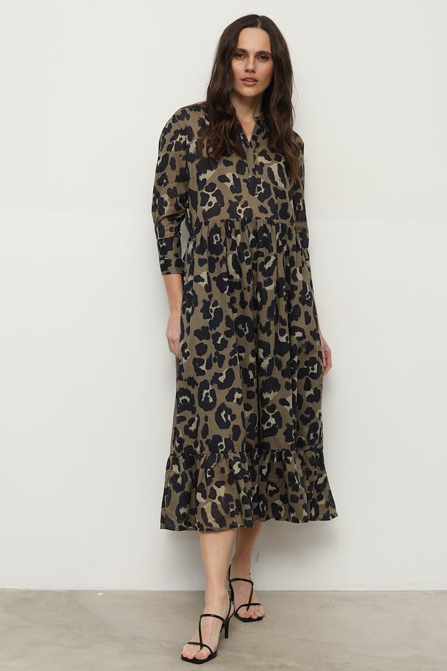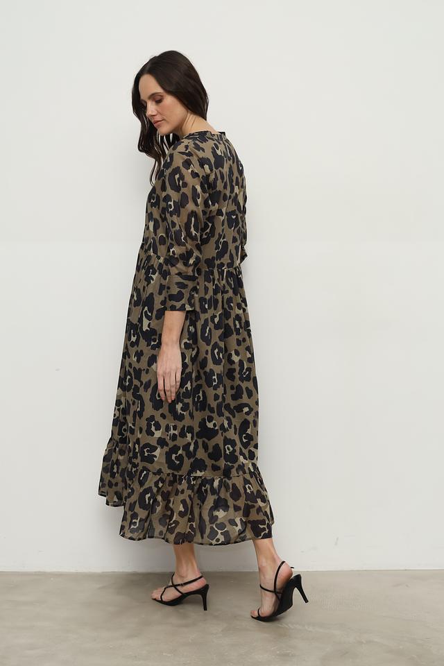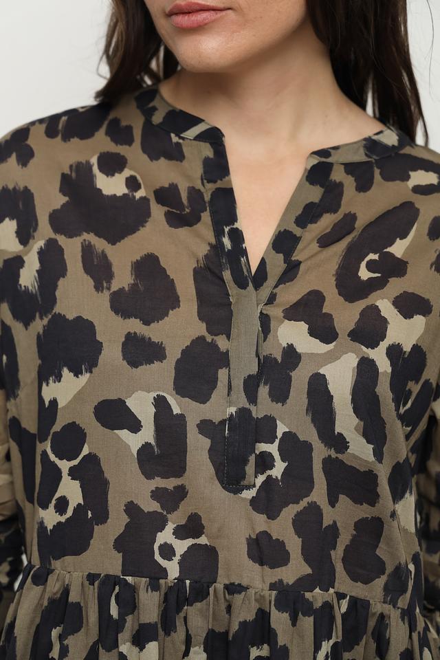 Это платье от Catnoir станет отличным дополнением к вашему гардеробу. Оно выполнено в хаки цвете и украшено эффектным леопардовым принтом, который придает образу динамичность и индивидуальность.