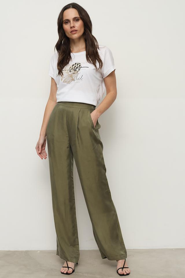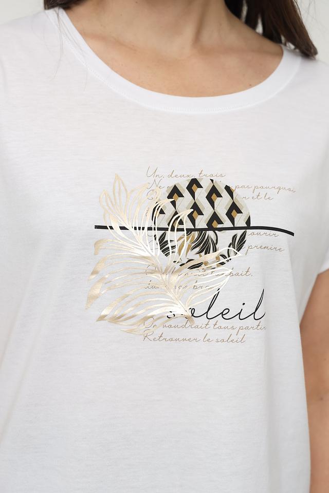 Эта стильная футболка от Catnoir выполнена в белом цвете и украшена эффектным принтом с изображением листьев и надписей в золотистых и чёрных тонах.