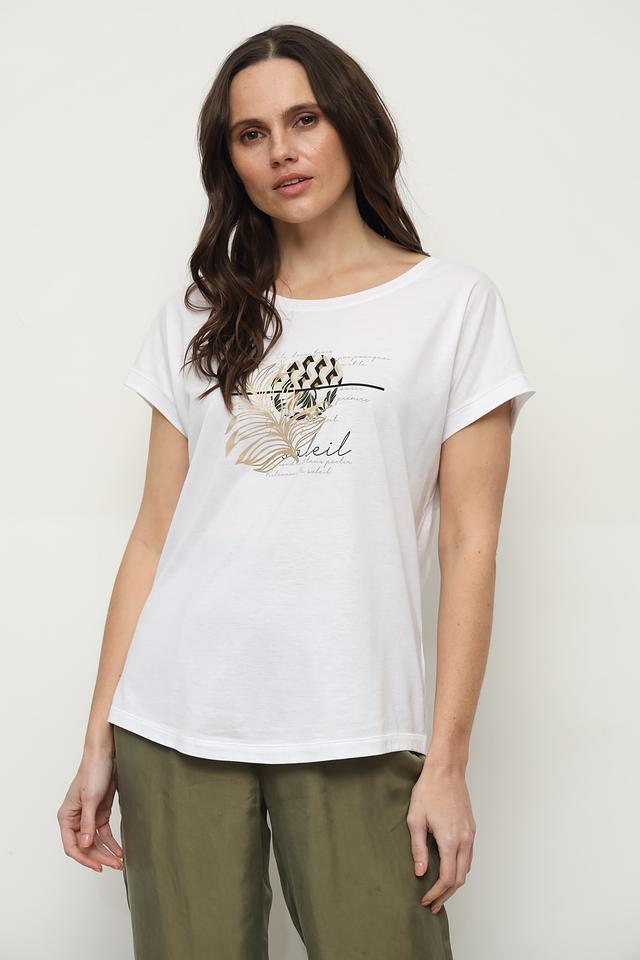 Белая футболка Catnoir с оригинальным принтом в виде листьев и надписей станет отличным дополнением к вашему гардеробу. Изготовлена из мягкого и приятного к телу сочетания хлопка и модала, обеспечивая комфорт в течение всего дня. Состав: хлопок 50%, модал 50%