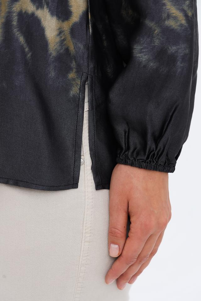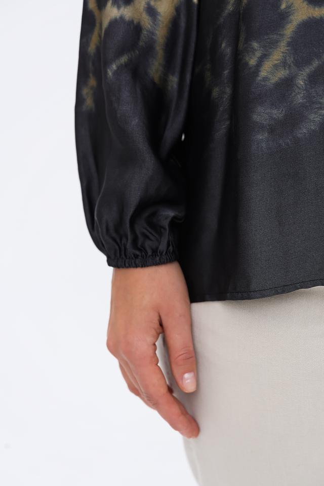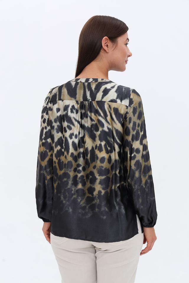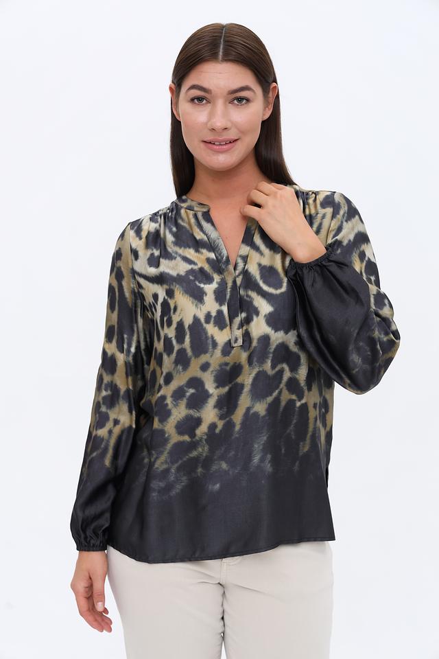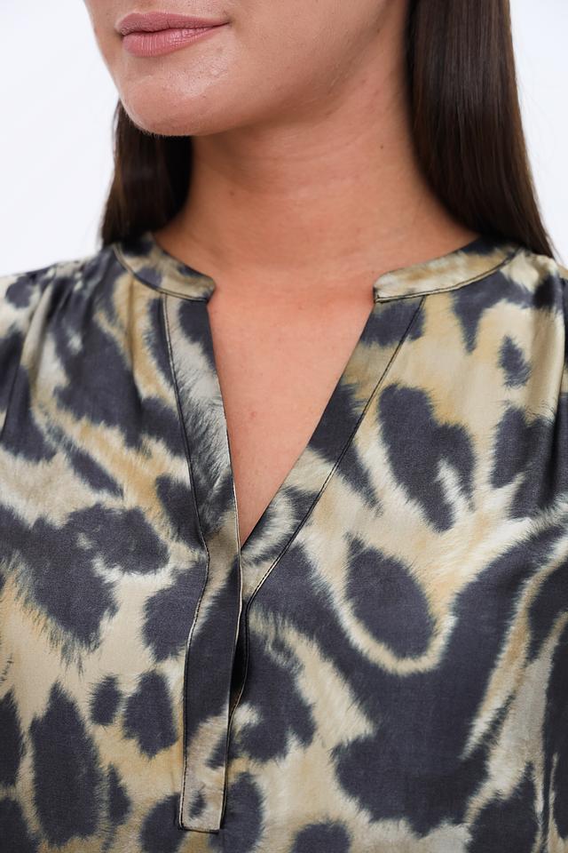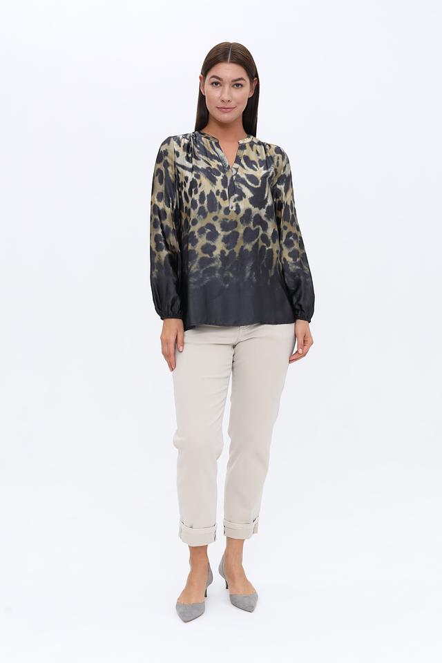 Блуза имеет оригинальный леопардовый принт, сочетающий в себе оттенки бежевого, коричневого и черного. V-образный вырез горловины и небольшая застежка на пуговицу добавляют изысканности.