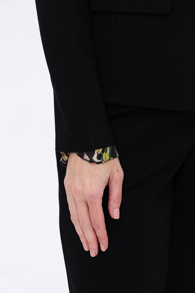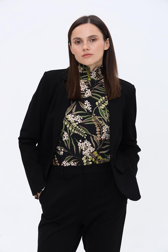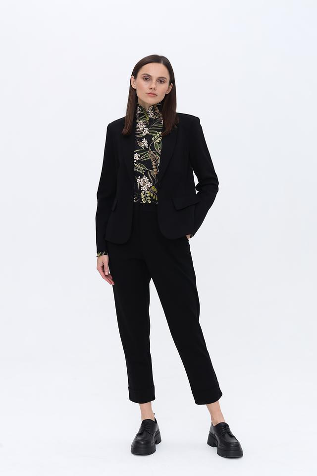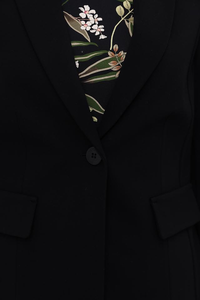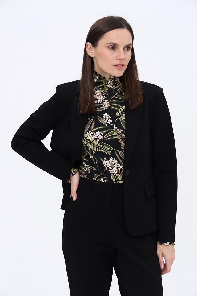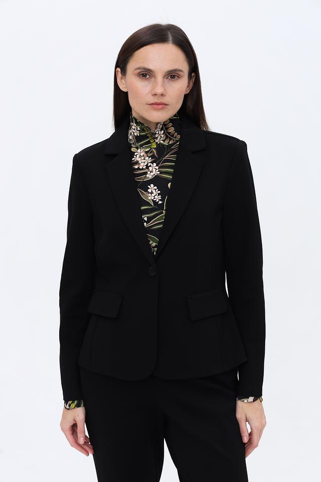 Жакет выполнен из сочетания вискозы, нейлона и спандекса, что обеспечивает приятные тактильные ощущения, хорошую посадку по фигуре и лёгкость в уходе. Однобортная застёжка на пуговицу и аккуратный отложной лацкан добавляют модели элегантности.