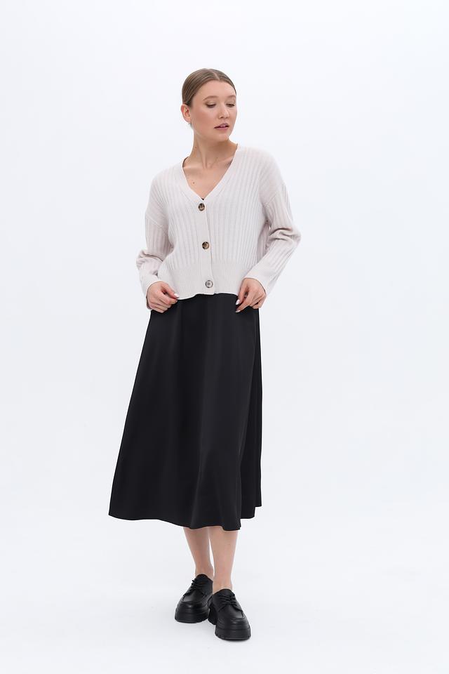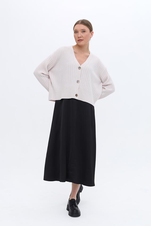 Застежка выполнена на ряд пуговиц в тон изделия. Вязаная текстура придает кардигану уютный и стильный вид.