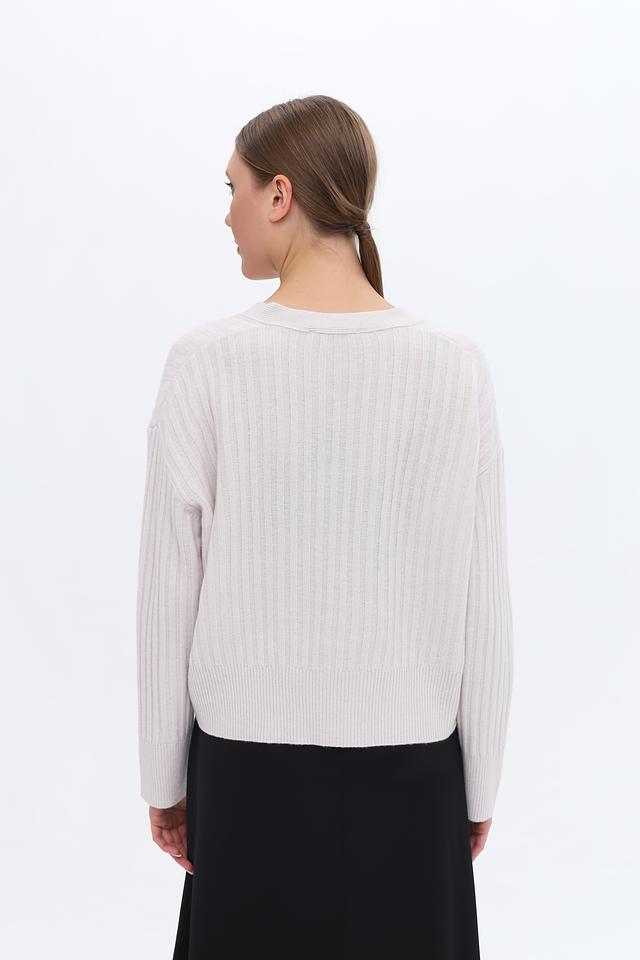 Модель имеет V-образный вырез и свободный, слегка укороченный крой, который отлично сочетается с юбками, брюками и платьями.
