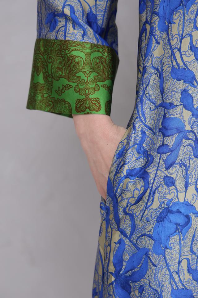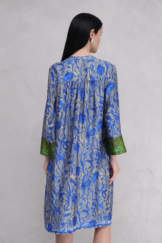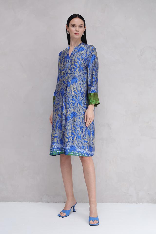 Платье имеет прямой силуэт, V-образный вырез горловины и рукава длиной три четверти. Особенностью модели является яркий цветочный принт, сочетающий в себе оттенки синего, золотистого и зеленого. Присутствуют небольшие складки, добавляющие платью объем и легкость.