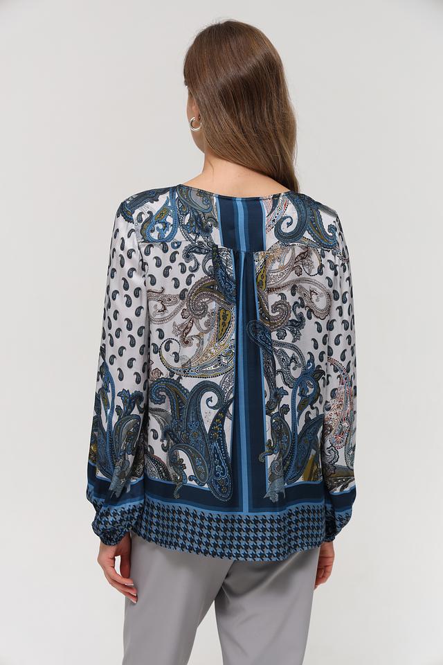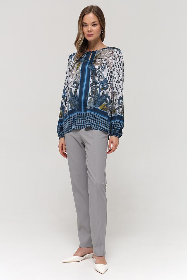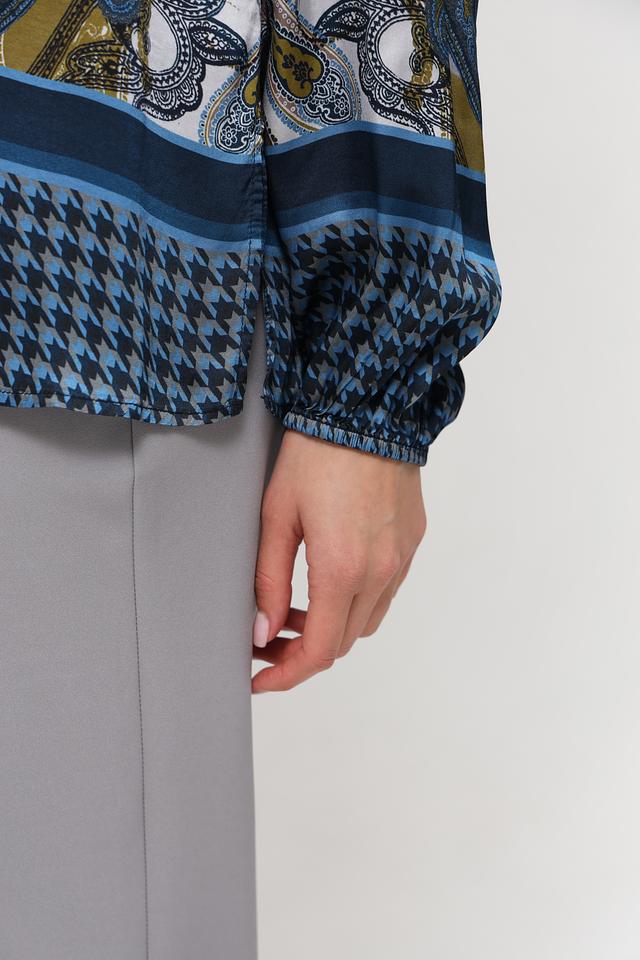 Блуза имеет свободный крой, который обеспечивает комфорт в носке. Вырез горловины оформлен небольшим разрезом и дополнением в виде завязок. Рукава блузы объемные, с манжетами на резинке, что придает им воздушность и легкость.