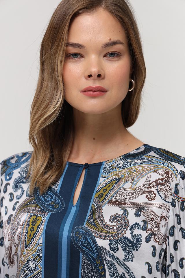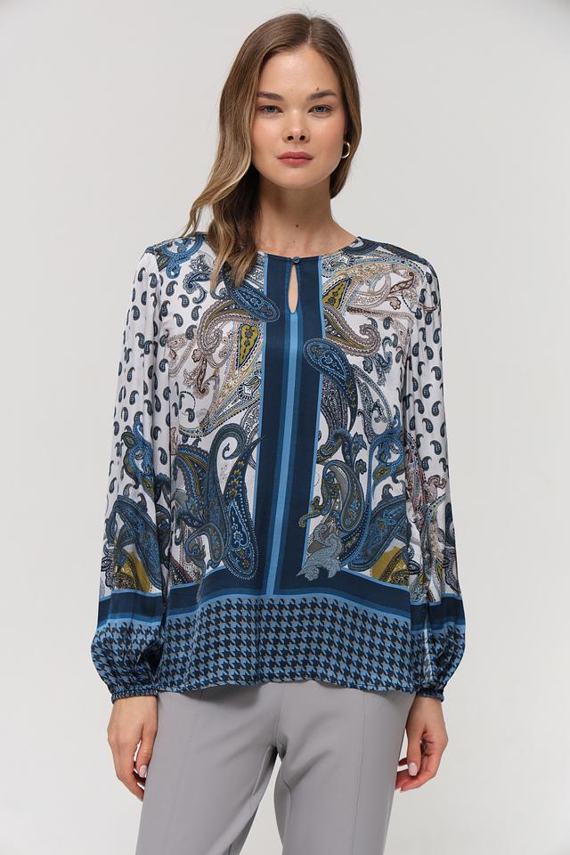 Эта изящная блуза от Catnoir выполнена из мягкой и приятной к телу вискозы. Преобладающий цвет – белый, дополненный ярким и детализированным принтом пейсли в синих, голубых и бежевых тонах.