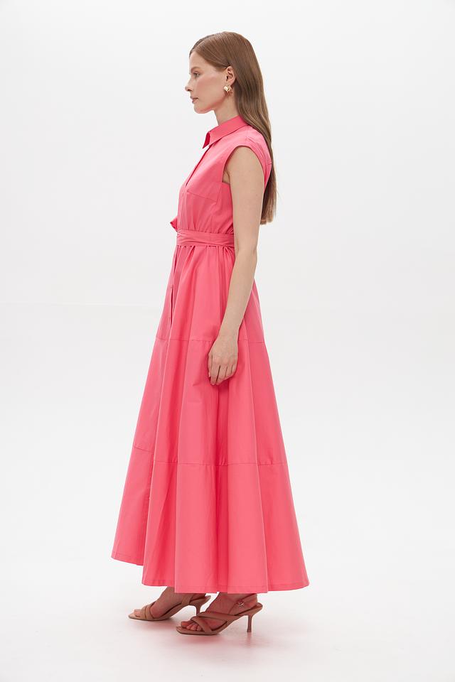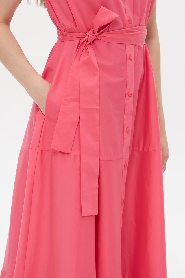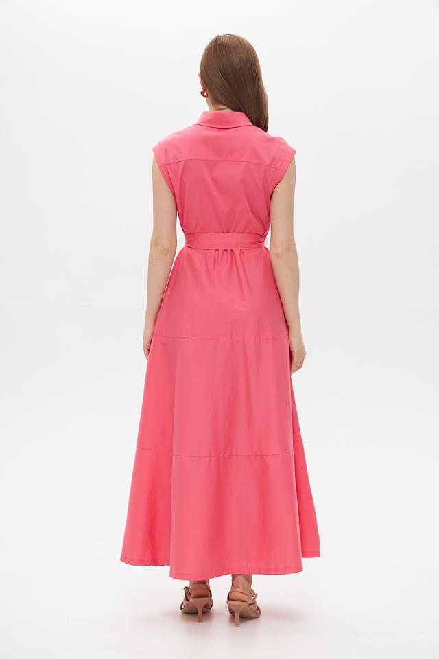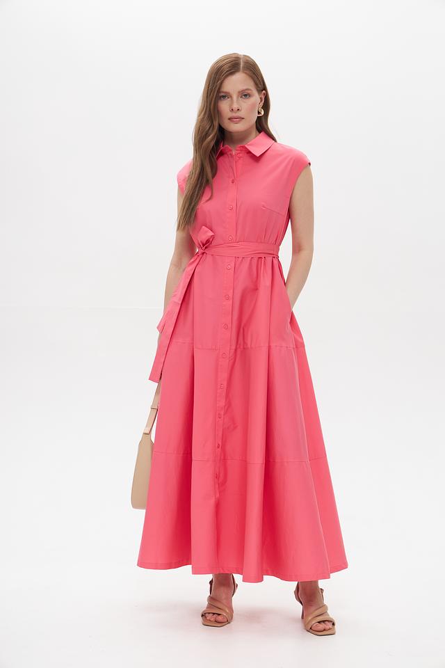 Платье имеет воротник-стойку, застегивается на пуговицы по всей длине и дополнено поясом, который подчеркивает талию. Накладные карманы добавляют практичности и расслабленности образу.