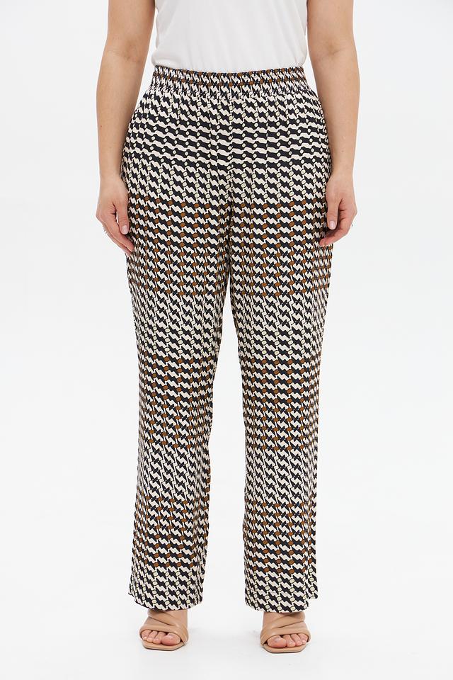 Особенностью модели является яркий геометрический принт, сочетающий в себе оттенки белого, черного и коричневого. Прямой крой и эластичный пояс на талии обеспечивают удобную посадку по фигуре.