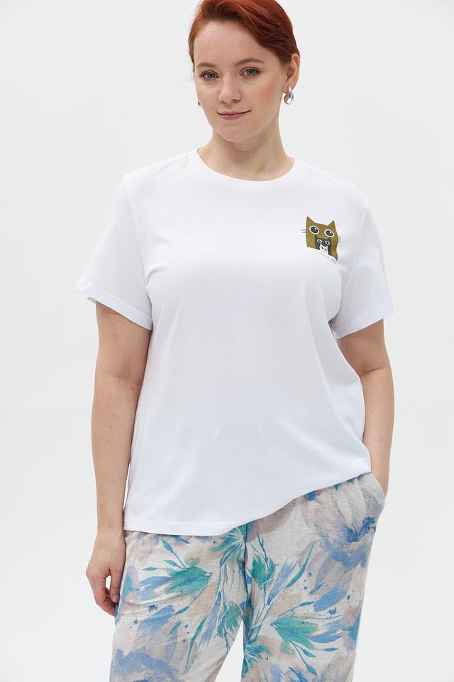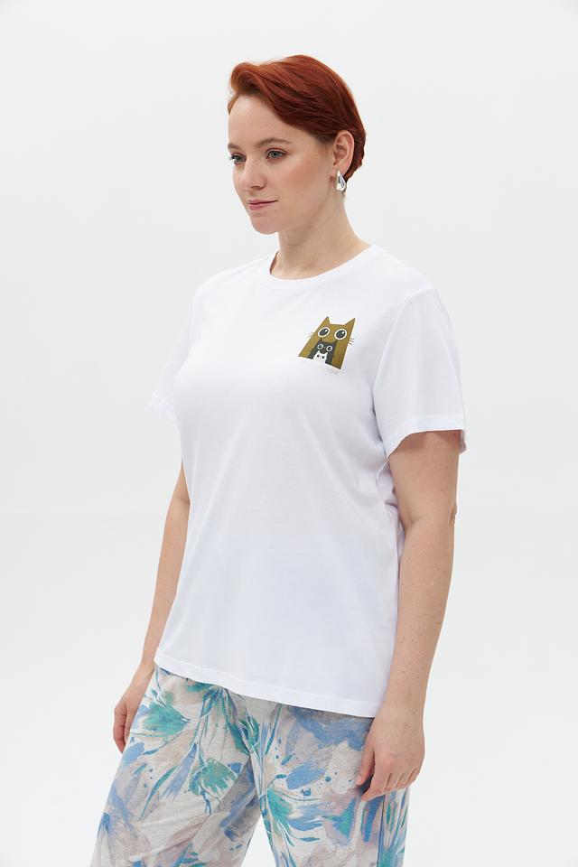 Футболка имеет прямой крой и короткие рукава, что делает ее идеальной для теплой погоды. Оригинальный принт с изображением котика добавляет игривости и индивидуальности образу.