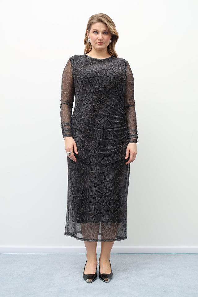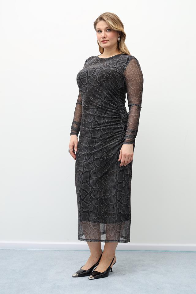Модель имеет длину миди, длинные рукава из полупрозрачной сетки и приталенный силуэт. Сбоку на талии предусмотрена небольшая драпировка, которая визуально корректирует фигуру и добавляет образу женственности.