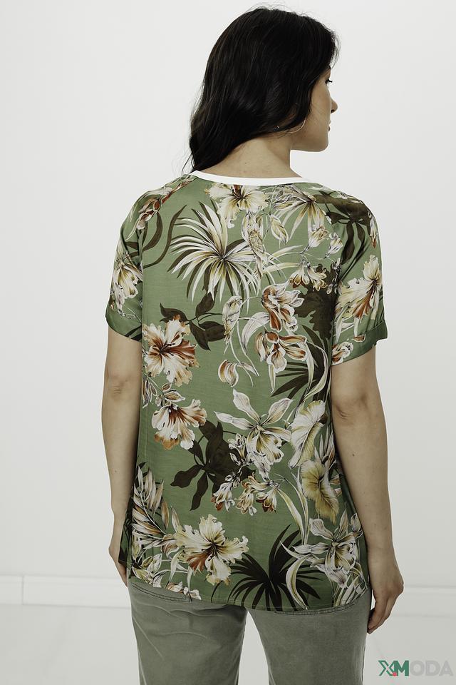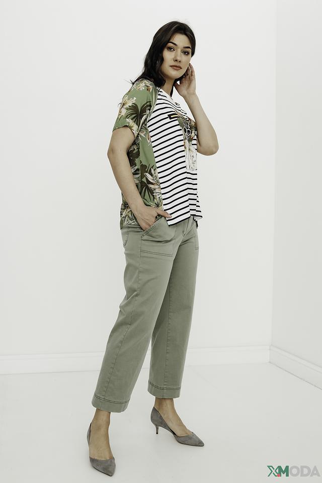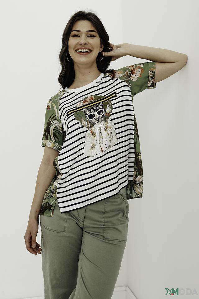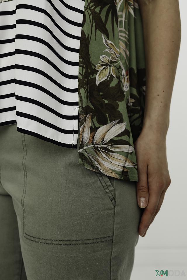 Блуза имеет свободный крой, короткие рукава и круглый вырез горловины. Полосатая часть блузы плавно переходит в зеленую с тропическим цветочным принтом, создавая интересный визуальный эффект.