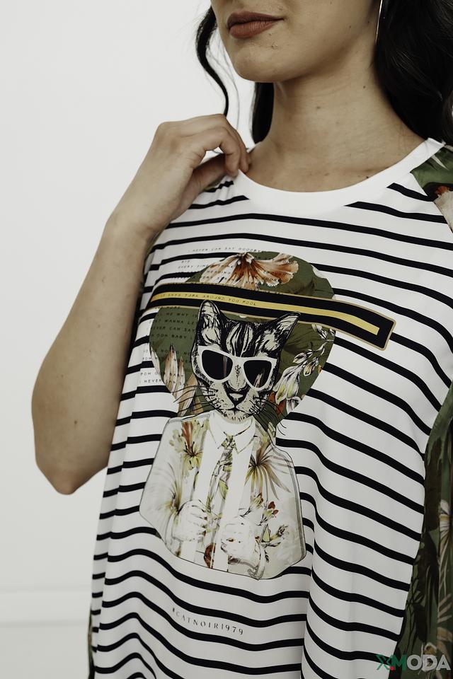 Женская блуза Catnoir зеленого цвета с ярким принтом кота и полосатым дизайном. Изготовлена из мягкой вискозы со спандексом для комфорта и свободы движений. Состав: вискоза 97%, спандекс 3%
