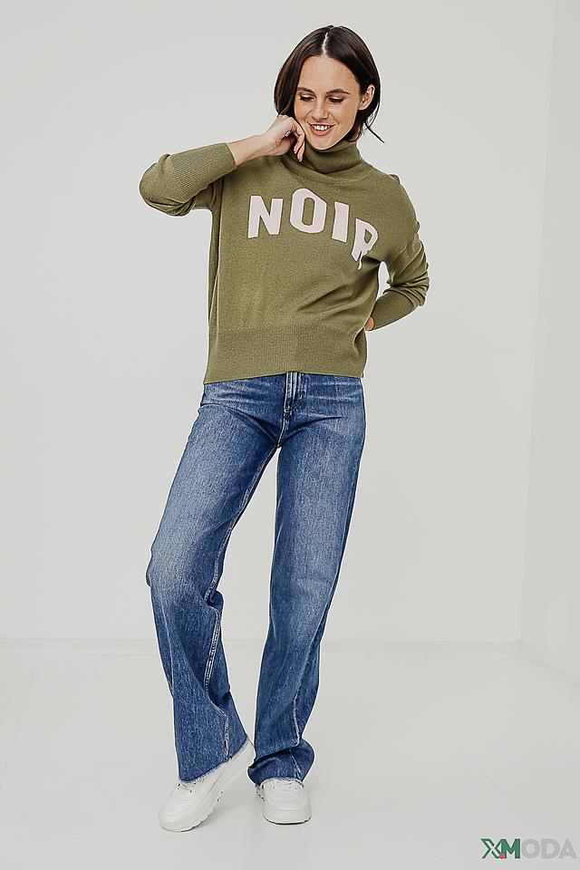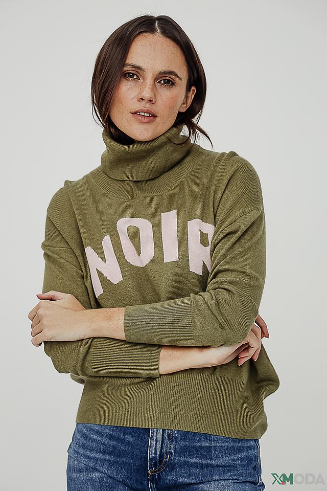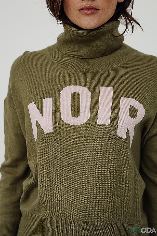 Водолазка имеет прямой крой и длинные рукава. Основной цвет изделия – оливковый. На передней части водолазки расположена надпись "NOIR", выполненная белым цветом, что придает ей особый стиль и узнаваемость.