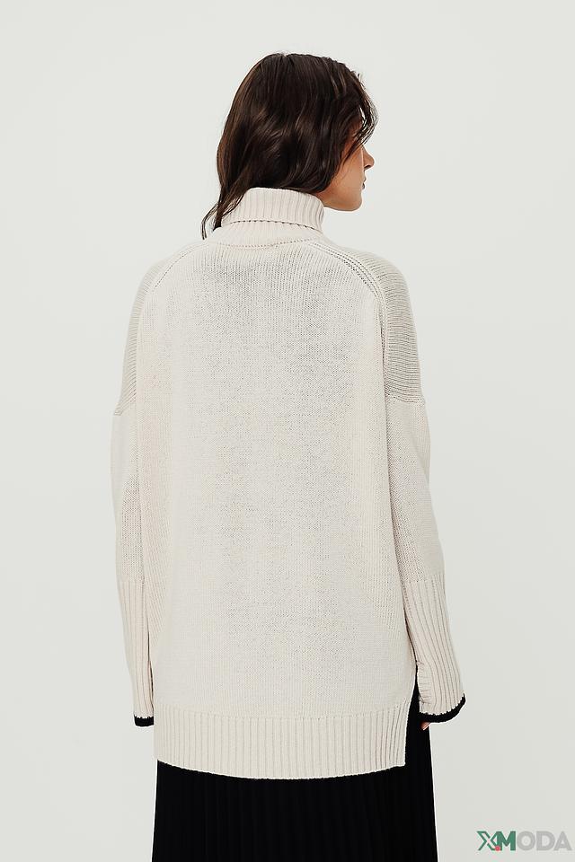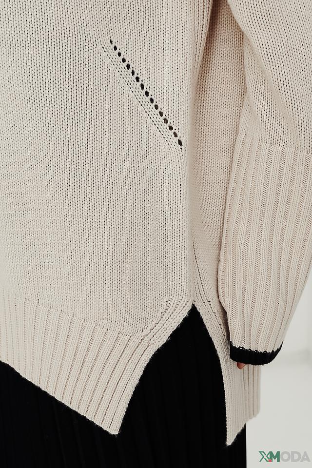 Пуловер имеет высокий воротник и свободный крой, что обеспечивает свободу движений. На лицевой стороне пуловера расположена надпись "La Vie Est Belle" чёрного цвета, которая добавляет образу оригинальности и стиля.
