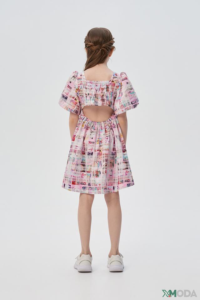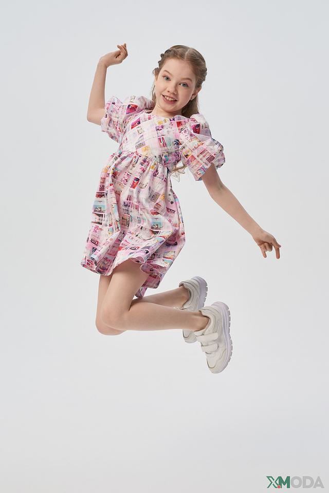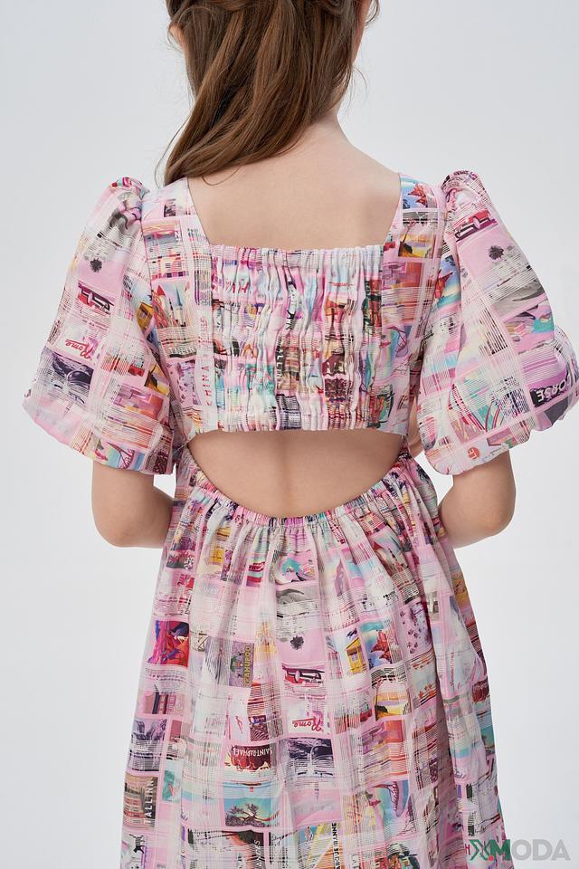 Основной цвет платья – нежно-розовый, украшен ярким и красочным принтом, напоминающим открытки и летние пейзажи. Силуэт платья – свободный, А-образный, что обеспечивает комфорт и свободу движений. Короткие рукава-фонарики добавляют образу игривости и очарования.