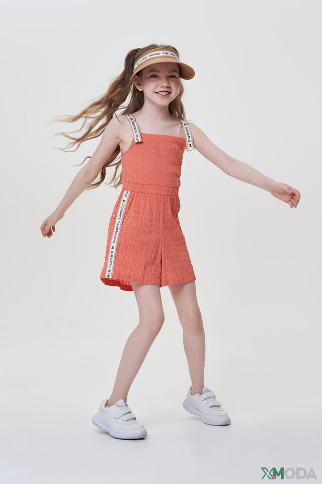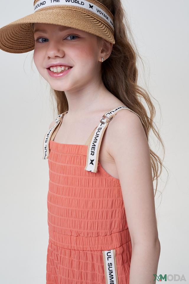 Модель имеет яркий персиковый цвет и выполнены в стиле casual. Платье имеет эластичную сборку на груди и талии, что обеспечивает идеальную посадку по фигуре. Тонкие бретели декорированы надписями, добавляющими образу игривости.