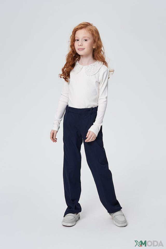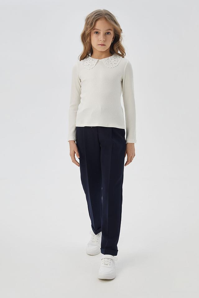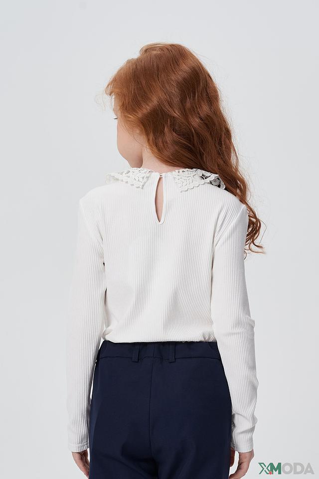 Блуза имеет классический крой с длинными рукавами и аккуратным круглым вырезом. Главной особенностью модели является изысканный кружевной воротник, который придает образу нарядность и женственность. Ткань блузы – мягкий трикотаж в рубчик, приятный к телу, обеспечивающий комфорт в течение всего дня.