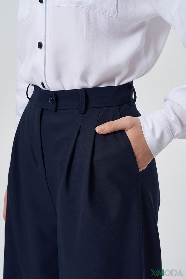 Брюки имеют широкий крой и прямые штанины, обеспечивающие комфорт и свободу движений. Пояс дополнен аккуратными защипами, придающими брюкам более элегантный вид. Застежка – молния и пуговица.