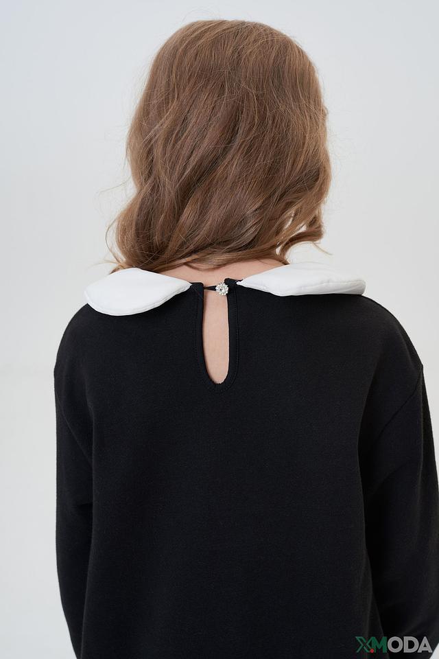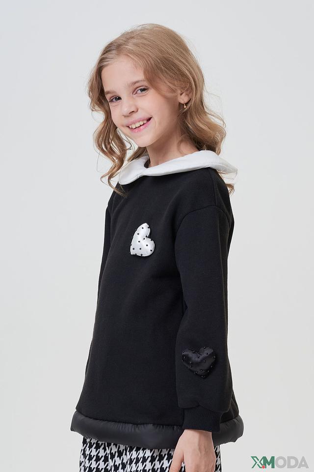 - Дизайн и декор: Классический черный цвет джемпера дополнен контрастным белым воротником и изящными аппликациями в виде сердец на груди и рукавах. Белый отложной воротник придает образу элегантность, а сердечки делают его более нежным и детским.